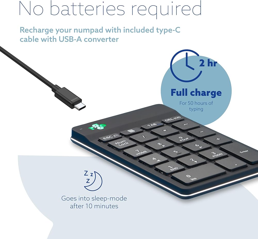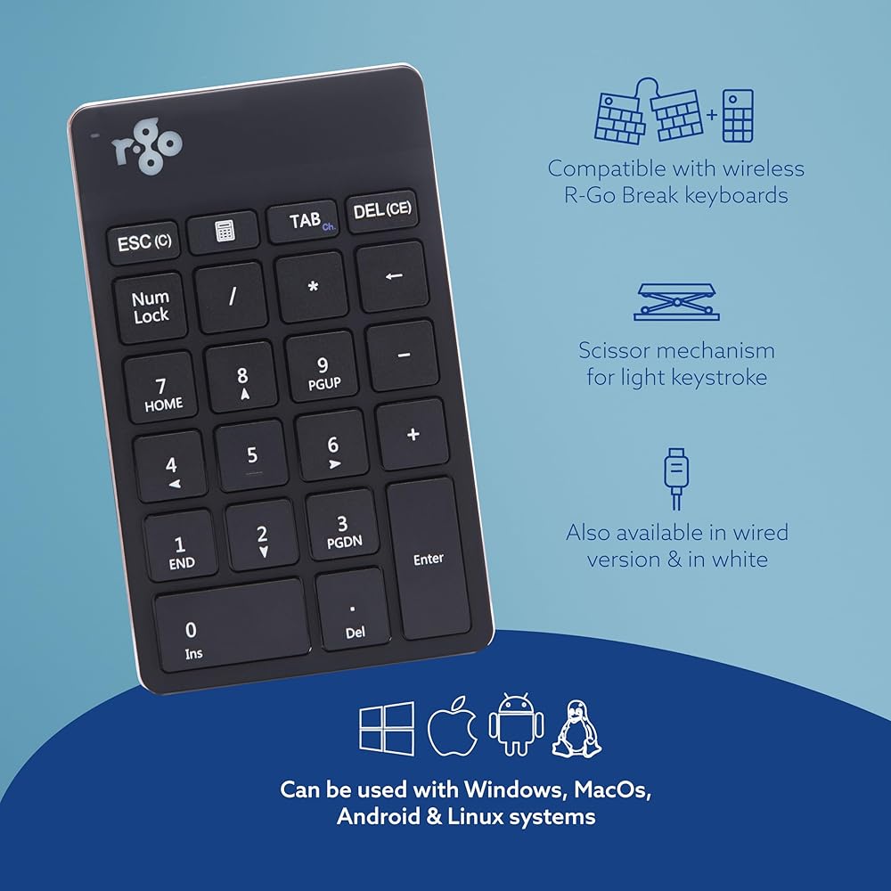 Compatible: This numpad is available wired and wireless. The wired numpad is easy to connect with the 1.5m USB cable, while the wireless variant works with Bluetooth connection. Can be used separately or with R-Go Break keyboards