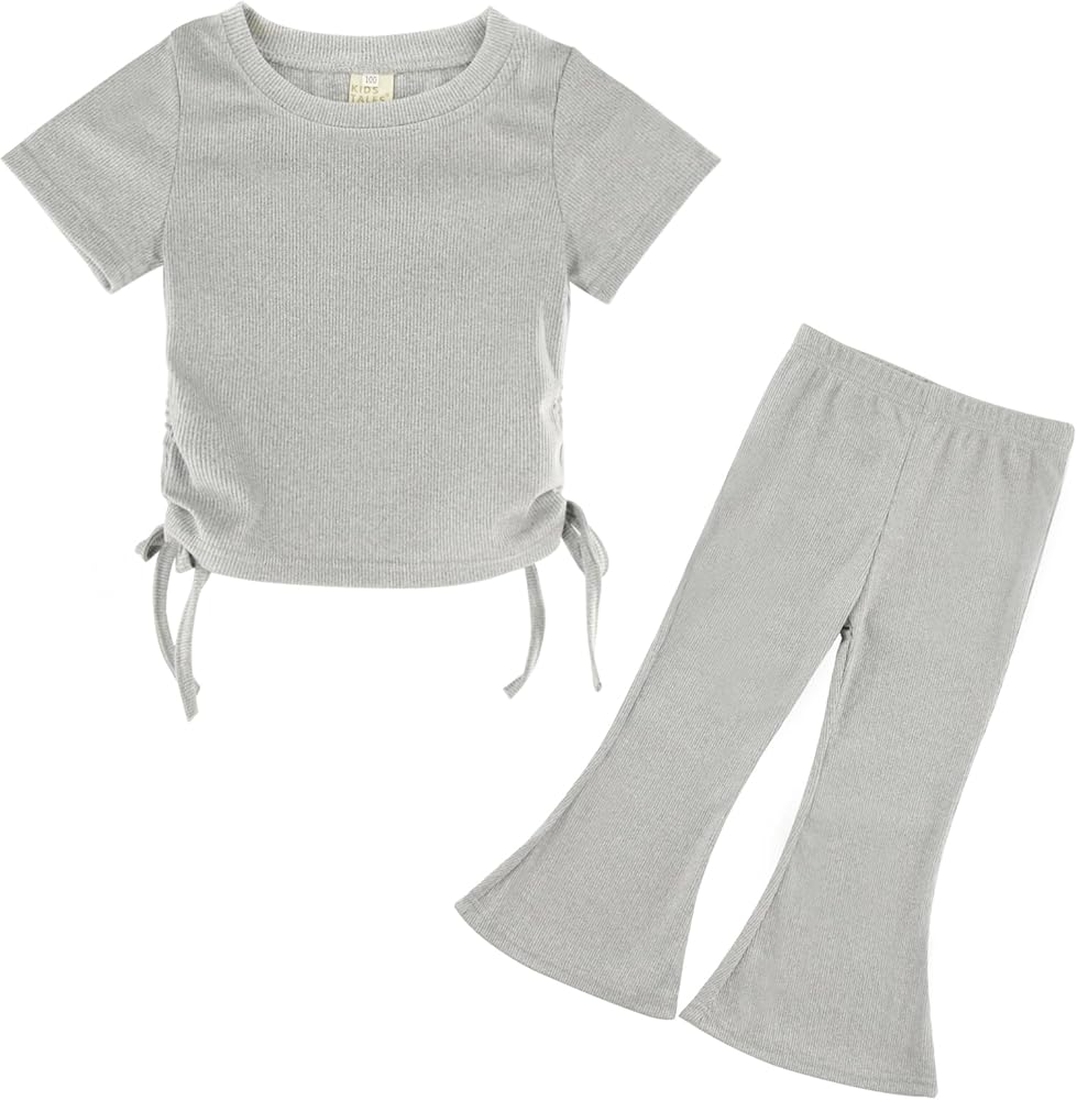 Design: Baby girl spring clothes set, round neck, toddler girl solid plain colors t-shirt tops tee, ribbbe knit fabric, short sleeve, matching with elastic waist flare leggings pants, provides a great fit. toddler bell-bottom, Perfect toddler baby girls summer outfits for vacation or stylish wear.