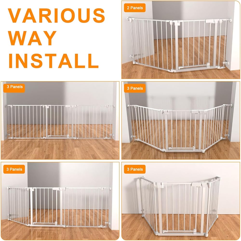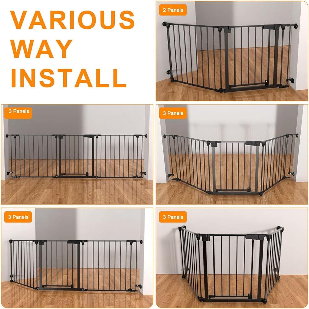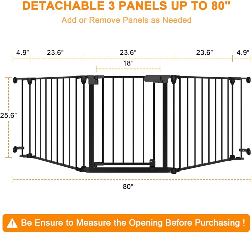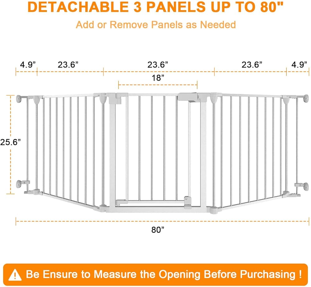 33-80Inch Extra Wide - 25.6inch tall:wide and height of the dog gate with door are very suitable for installation in angleto use around fireplaces, grills, wood burning stoves, Christmas tree openings, doors, hallways, stairs,houses,kitchens,laundry rooms, Bedrooms, and playrooms