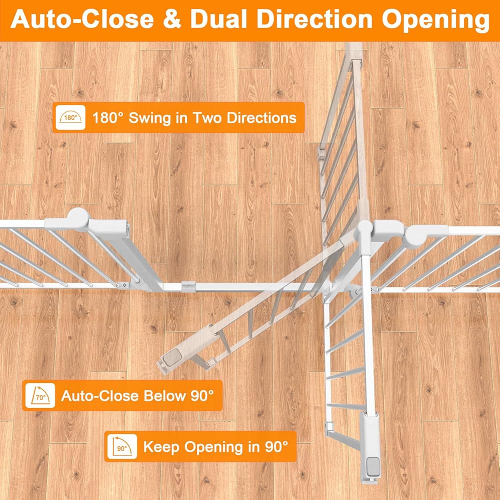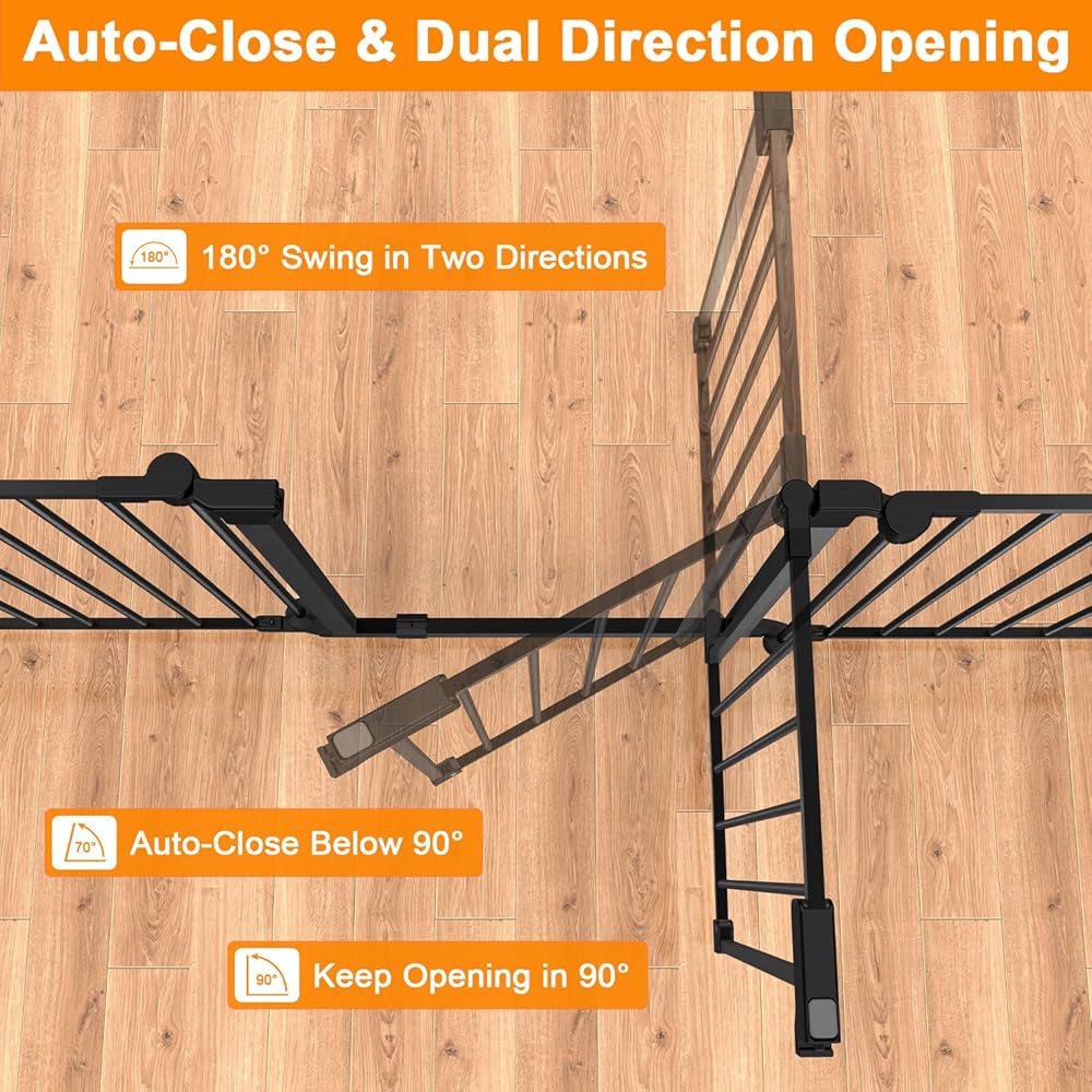 Convenient Design:two usage methods of automatic door closing and keeping open. the angle at which the baby gate is opened is less than 90 degrees, it can automatically close. If it is greater than 90 degrees, it will remain open , one hand can easily open the door, and supports two-way opening