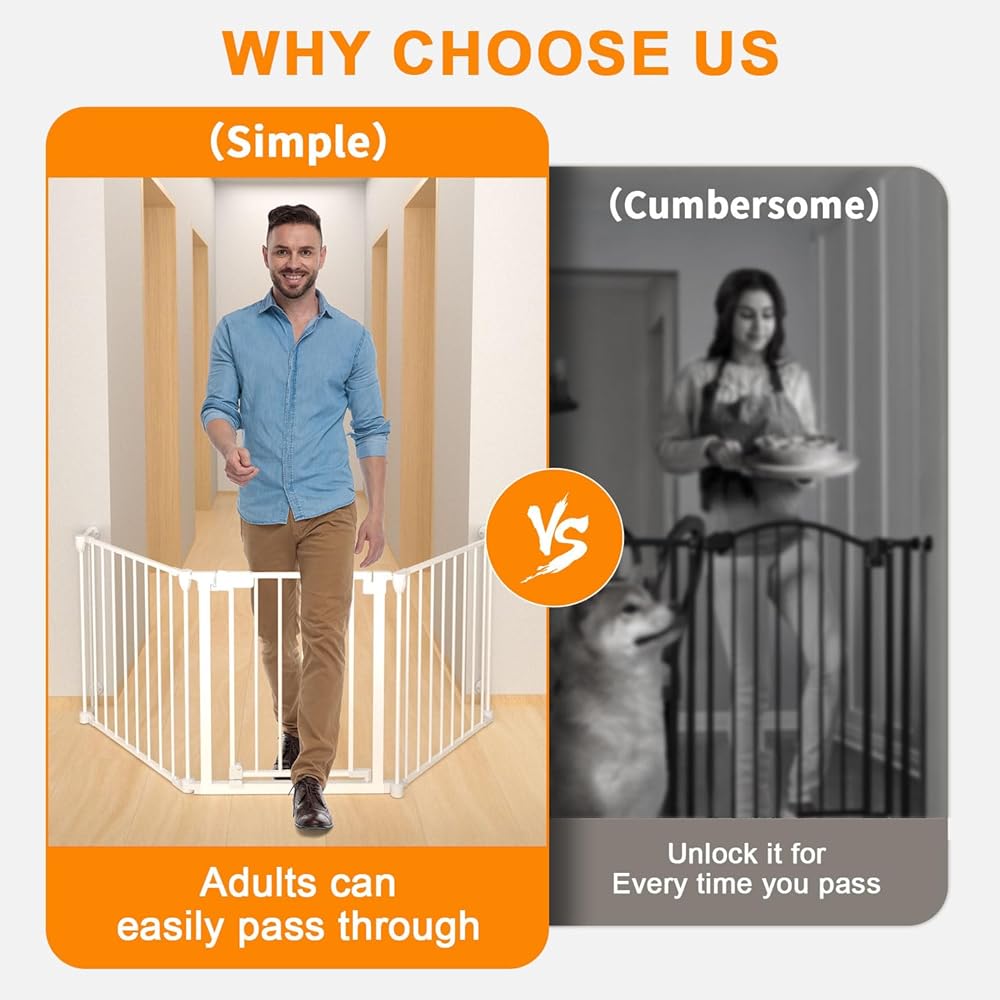 Easy to pass height: The height of the extra wide baby gate is 25.6 inch, which adults no need to open the door can easily pass through. This height is a bit difficult for babies and pets. If babies or pets need to pass through the baby gate, we also provide doorway