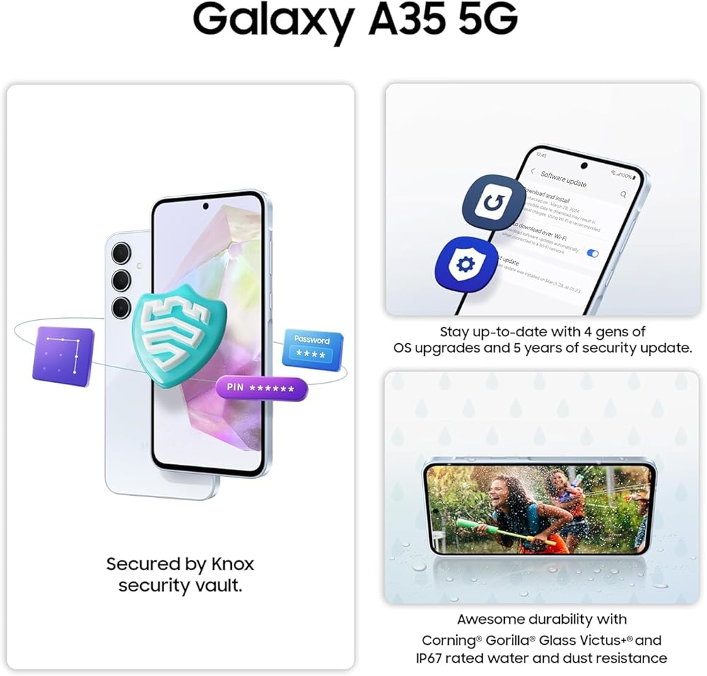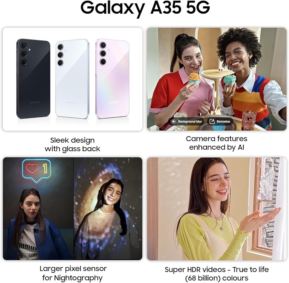 The Samsung Galaxy A35 5G excels as an affordable smartphone with standout features. It sports a durable glass back and a sleek design, complemented by a vibrant 6.6-inch AMOLED display protected by Gorilla Glass Victus+. Powered by an efficient chipset, it offers reliable performance suitable for everyday tasks. Photography is a highlight, with a 50MP main camera that captures detailed images and an 8MP ultra-wide along with a 5MP macro lens that adds versatility. The camera's enhanced HDR performance ensures dynamic photos in various lighting conditions. Audio quality is robust with two clear and rich-sounding speakers, enhancing the media viewing experience. The device's 5000mAh battery supports extended use, optimized by a display with a variable refresh rate for better power management. Running on Android 14 with Samsung's One UI 6.1, the Galaxy A35 5G provides a smooth, customizable interface with features like Quick Share for easy file transfers. While it includes some bloatware, the overall user experience remains strong, making it a top choice in its price segment for its display, camera capabilities, and battery life.