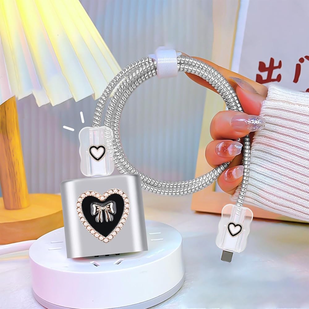 CameCosy DIY Phone Charger Case Storage Set Wire Saver Cable Organizer with Travel Storage Bag, Soft Cute Black Pearl Bow Tie Love Cable Charger Protector Cord Organizer for iPhone(Sliver)