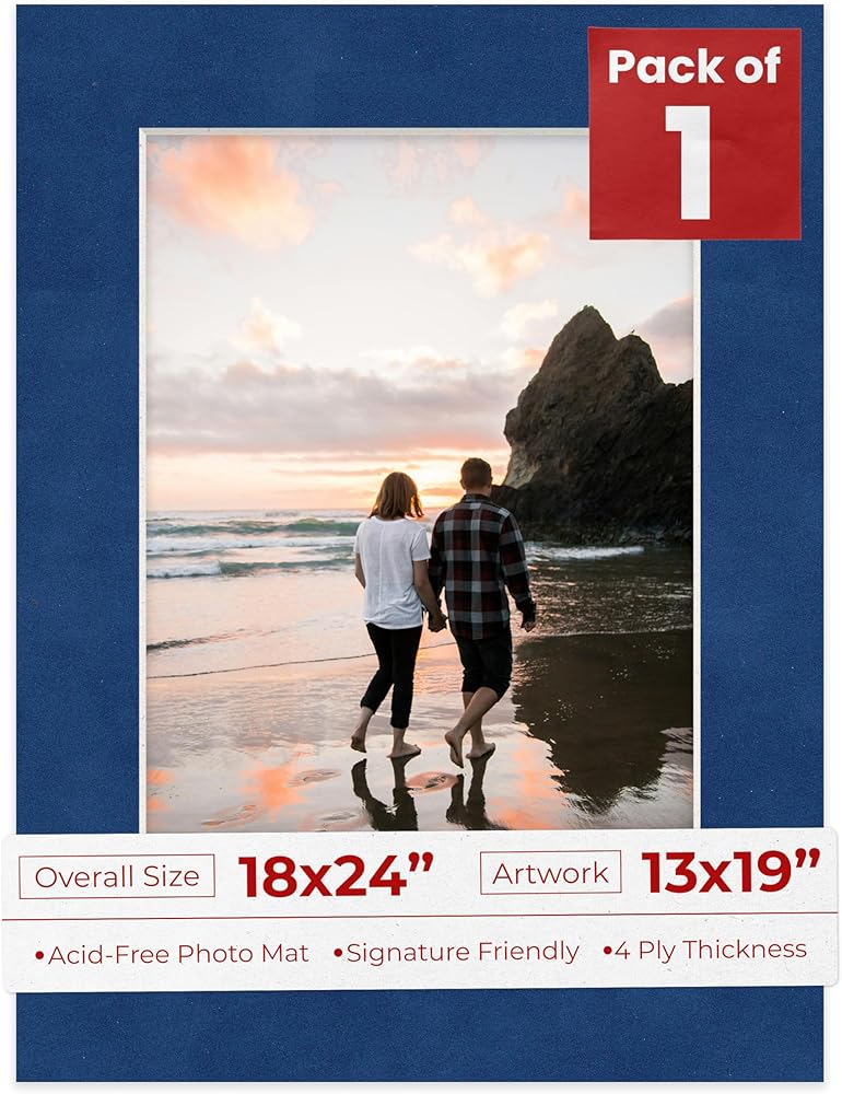 THIS IS FORA PACK OF 100 MATS without backing and bags , Featuring a picture opening for a 13x19 inch photo, to fit in a 18x24 inch picture frame. Photo openings are beveled cut 0.5" smaller than the art size advertised to overlap the photo and help keep it securely in the frame. MADE TO DISPLAY a 13x19 Photo and fit in a standard 18 x 24 Picture Frame. Vibrant Navy Suede color Acid Free Picture Matting. Great replacement for damaged, dirty, or faded matting in your old frames. PREMIUM QUALITY: Our precut photo matboards are acid free & precision cut with a 45 degree bevel by machine for perfect corners and NO over-cuts every single time! PRECUT ACID-FREE, PROFESSIONALLY BEVEL CUT Matte Board. Custom Frame Shop and Archival Quality. All of our Precut Matboards are proudly MANUFACTURED IN THE USA.