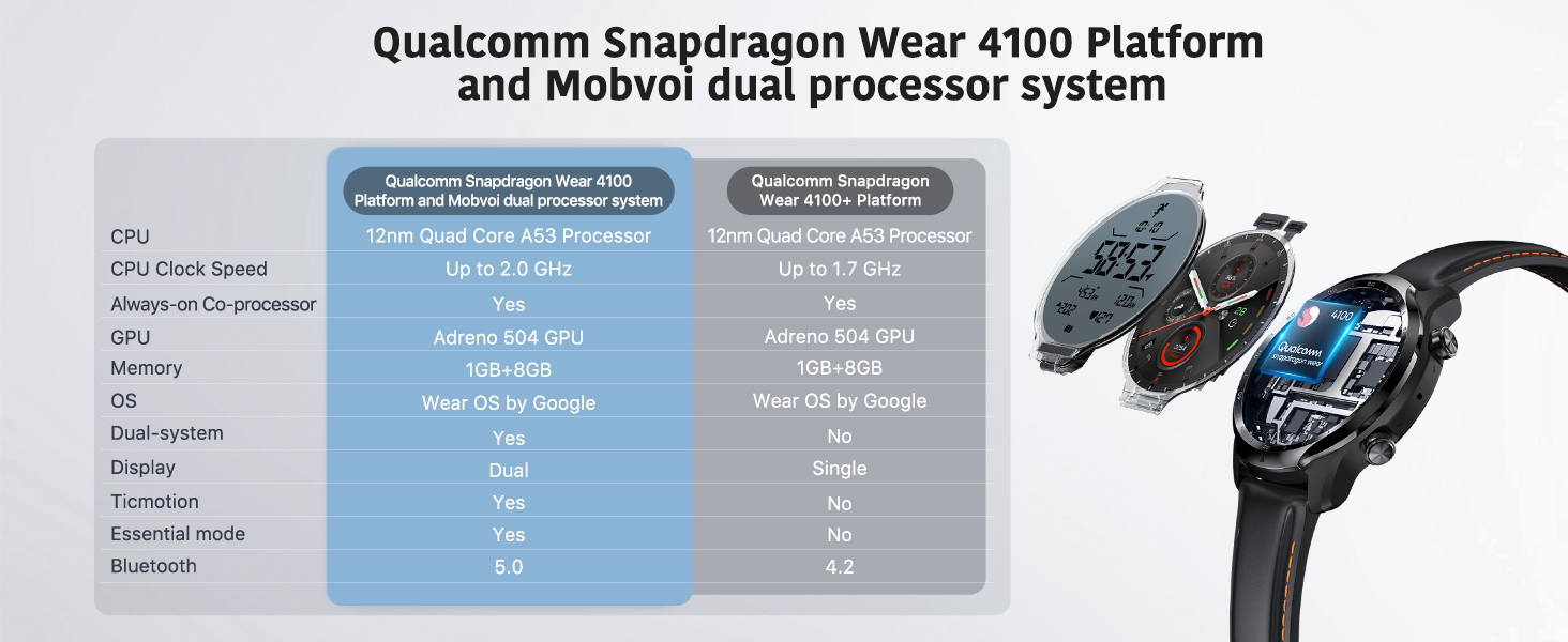 Updated Chipset, Better Experience - The 1st wear OS by Google smartwatch with the Qualcomm Snapdragon Wear 4100 Platform and Mobvoi dual processor system. 1G RAM and 8G ROM enable smoother performance and more precise interactions.