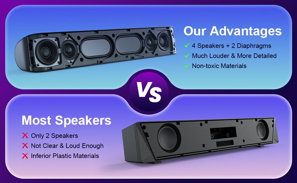 【Hi-Fi Stereo Sound Quality】Nylavee computer speakers equip with two double-layer neodymium magnets speaker units, two tweeters & two mica fiber diaphragms to provide rich high pitch and powerful bass. Whether you're watching movies, streaming music, or playing games, this computer sound bar will provide you with an unparalleled audio experience.
