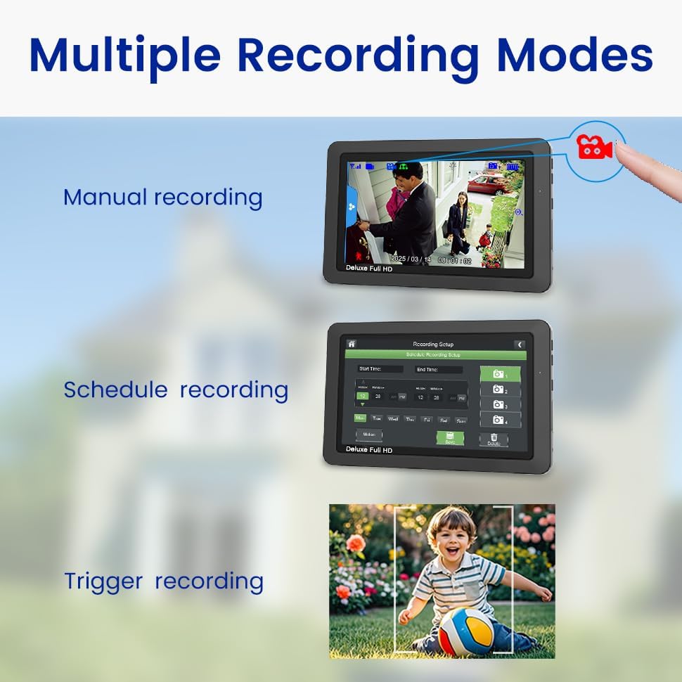 7” touchscreen monitor with auto, manual and scheduled recording modes. Five second pre-record period ensures the event is fully captured. Remote access for smartphone and tablet. Rechargeable battery and internal SD card included with the monitor.