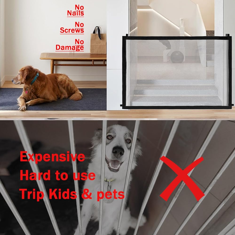 【High Quality And Ultra Durable】Our mesh dog gate is made of thick nylon fabricandstainless steel telescoping rods,strong bite resistance and not easy to break.The stair dogdooris designed to withstand pets' paws,so the magic door is hard to break and dogs can'teasilypass through.