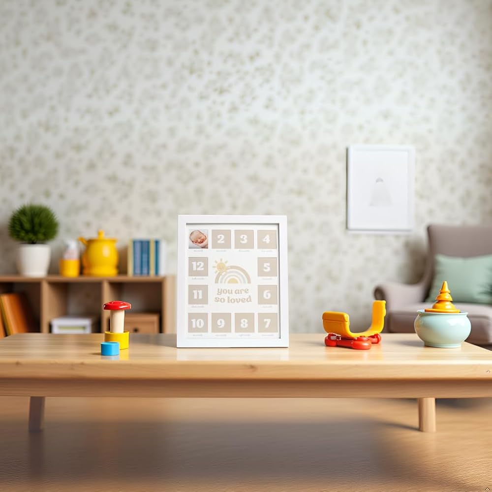 0-12 Month Baby Pictures: Includes 12 individual slots measuring 2” x 2” to showcase your baby's growth from one month to twelve months old. Add a new milestone photo each month and watch as your tiny newborn grows into a curious toddler