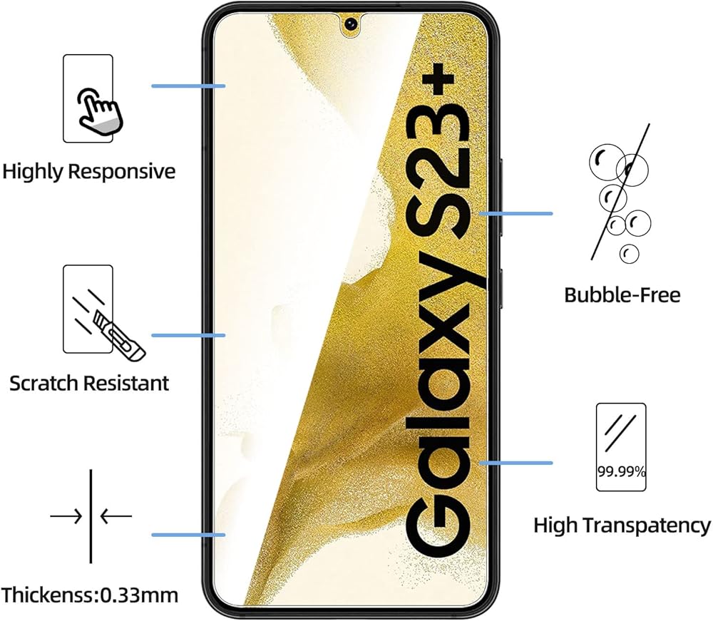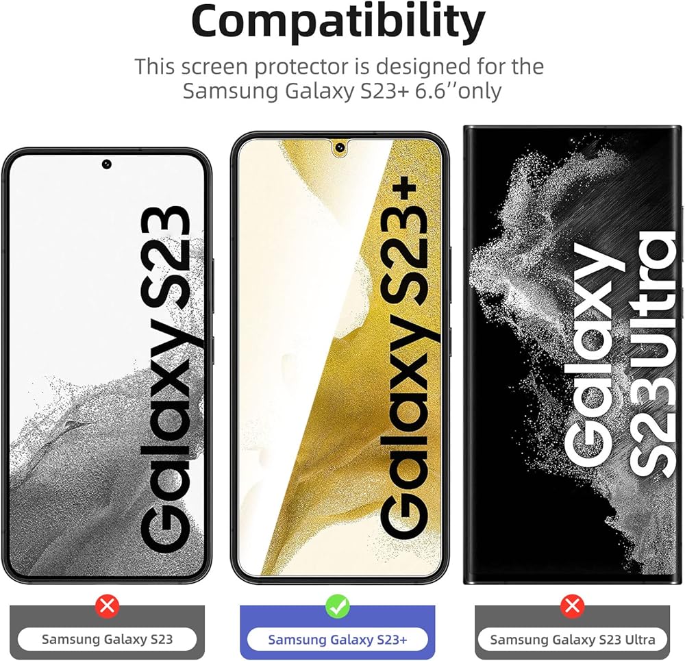 The screen protector provides the maximum protection for the Samsung Galaxy S23 Plus / S23+ touchscreen. The space between Samsung Galaxy S23 Plus / S23+ and the screen protector enables the proper space for the installation of most phone cases.