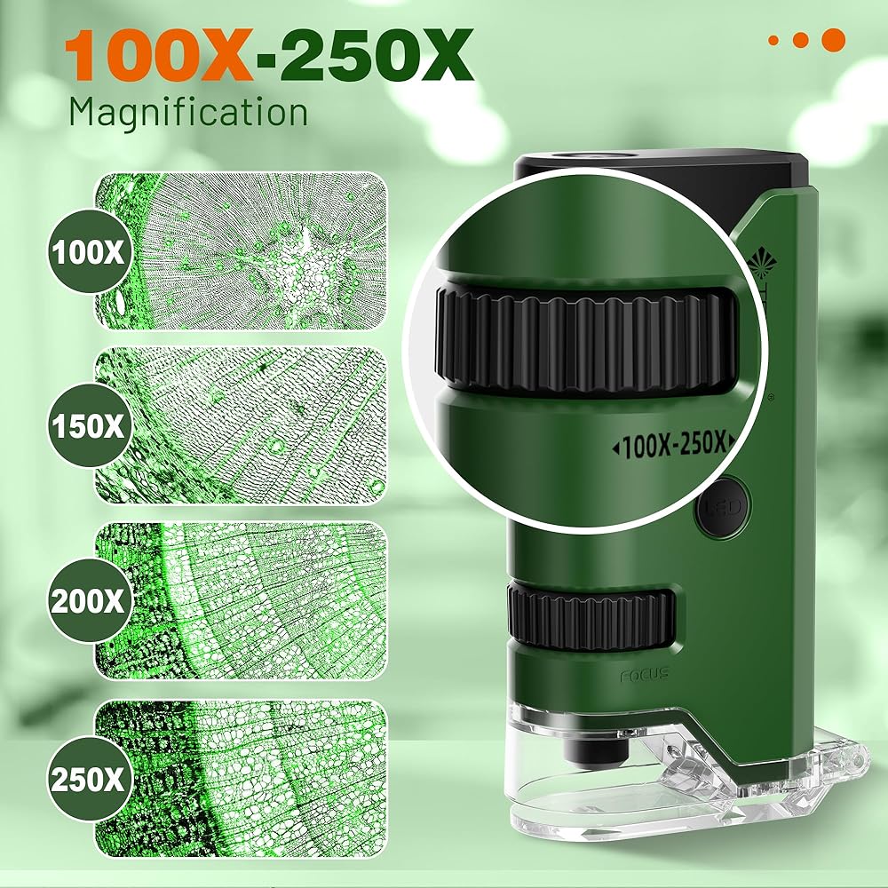 【High Magnification】The mini pocket microscope offers 100-250X magnification, you can clearly see more cell details, it meets various magnification observation needs of little scientists/kids/adults to explore the microscopic world.