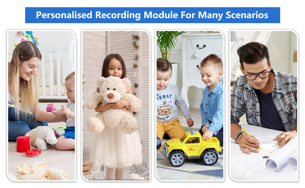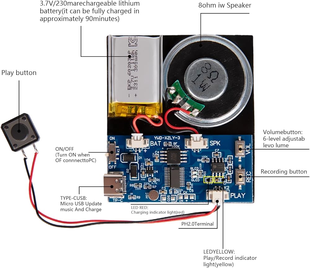 【USB Charging Recording Module】:Our module is rechargeable with a 3.7V battery (300mAh). Charge it via Micro USB-Type-C. It offers 23-minute recording time and easy addition of MP3 files via USB-Type-C. Enjoy long-lasting use and a personalized experience.Connect it to a computer or use a charger, and you're ready for long-lasting use through repeated charging cycles.