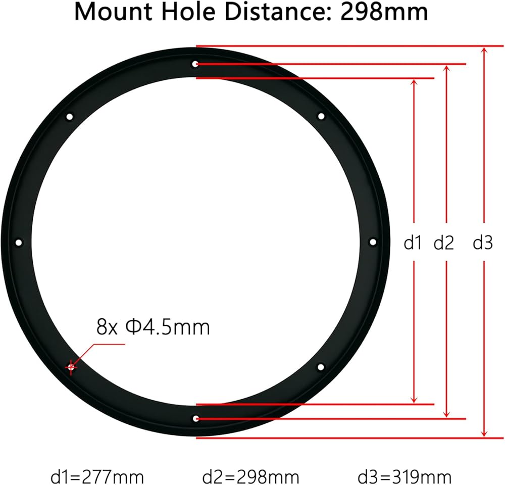 NOTE: 12 inch speakers have multiple mounting hole spacings, please measure the mounting hole spacing of your 12 inch speaker before purchasing, our product is only suitable for 12 inch speakers with a mounting hole spacing of 298mm