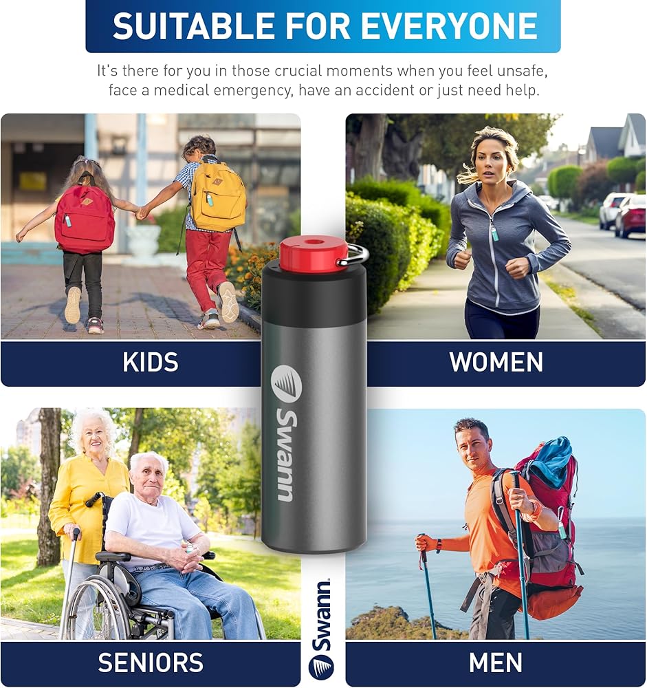 Swann's new ActiveResponse™ Smart Mobile Personal Safety Alarm is stylish yet discreet but has the power to potentially save your life. When you find yourself in the presence of danger or become lost, pull the pin for a loud 110 decibel siren, and / or push the button to alert your primary emergency contact of your location for FREE. A perfect personal security alarm for women. Pair the Mobile Personal Safety Alarm with the Swann Security app on your phone via Bluetooth, to ensure your family, friends, and even emergency services (via subscription), can be alerted to your location. Use the included keyring to clip the Alarm to your keys, bag, backpack, school bag, or use the lanyard to wear it around your neck. Stylish and discreet, it is small enough to carry in a handbag or in your hand. A useful accessory. Use as safety device while running or hiking. With a sturdy, compact design and long battery life, they are the perfect companion for a walk, run, hike or trek. Take one with you when you travel, as they are even allowed on planes where pepper spray and tasers aren't. A perfect personal safety Alarm for women's self defense. Choose between the black or aqua colored finishes. ActiveResponse™ is also a great gift idea for family, students, seniors, the disabled, shift workers, outdoor enthusiasts and more. The best personal security for women, and self defense for life on the move!