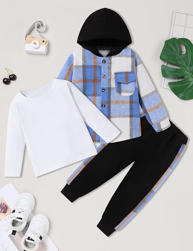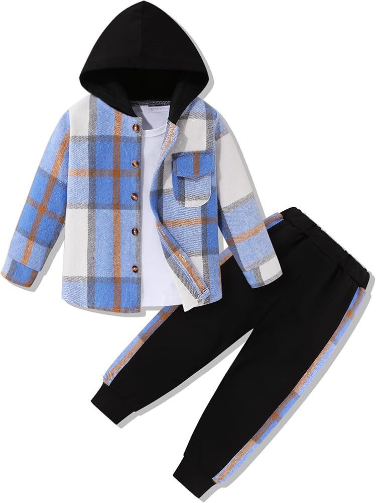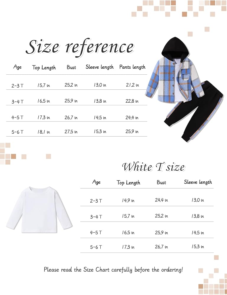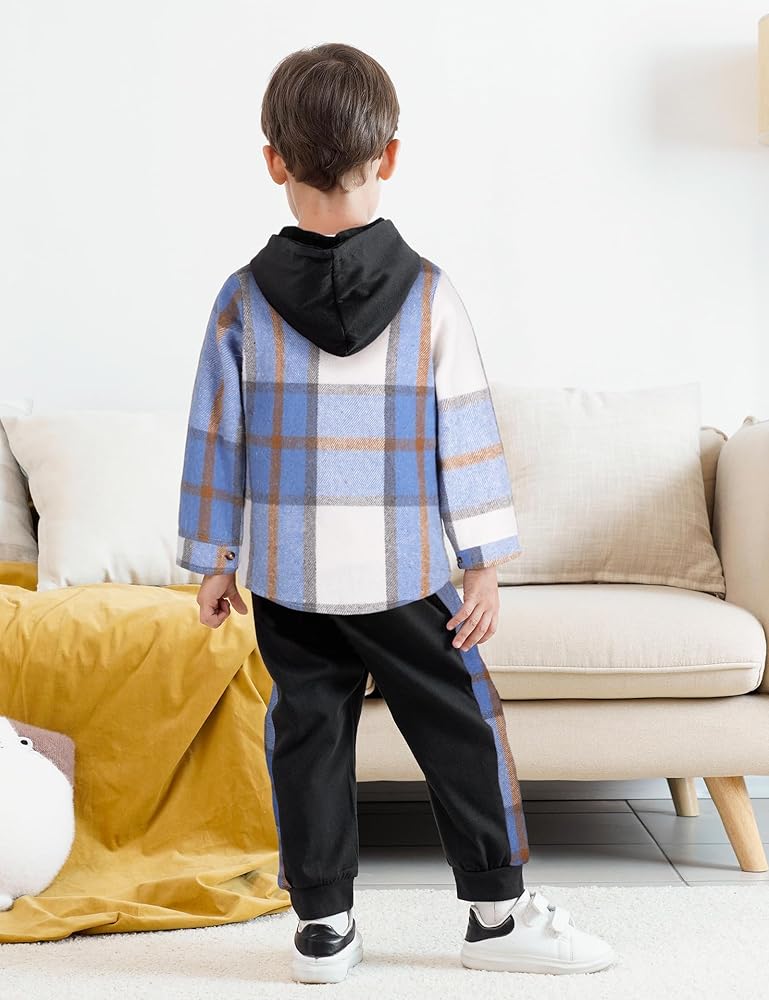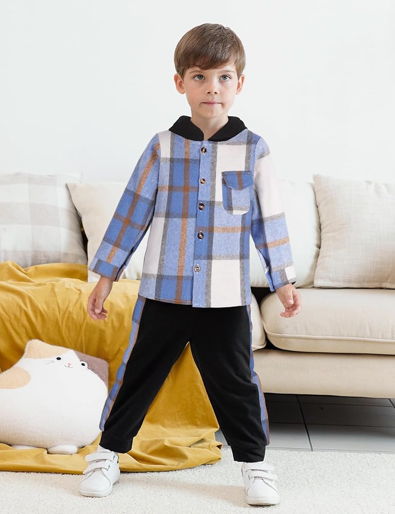 Design:Long white sleeves ensure warmth in cool weather, and hooded flannel tops with different plaid blocks add interest and visual appeal. The hooded design provides extra head protection for children during outdoor activities. The trousers are decorated with plaid, and the loose, moderate and flexible tailoring ensures that children are free to run and play.