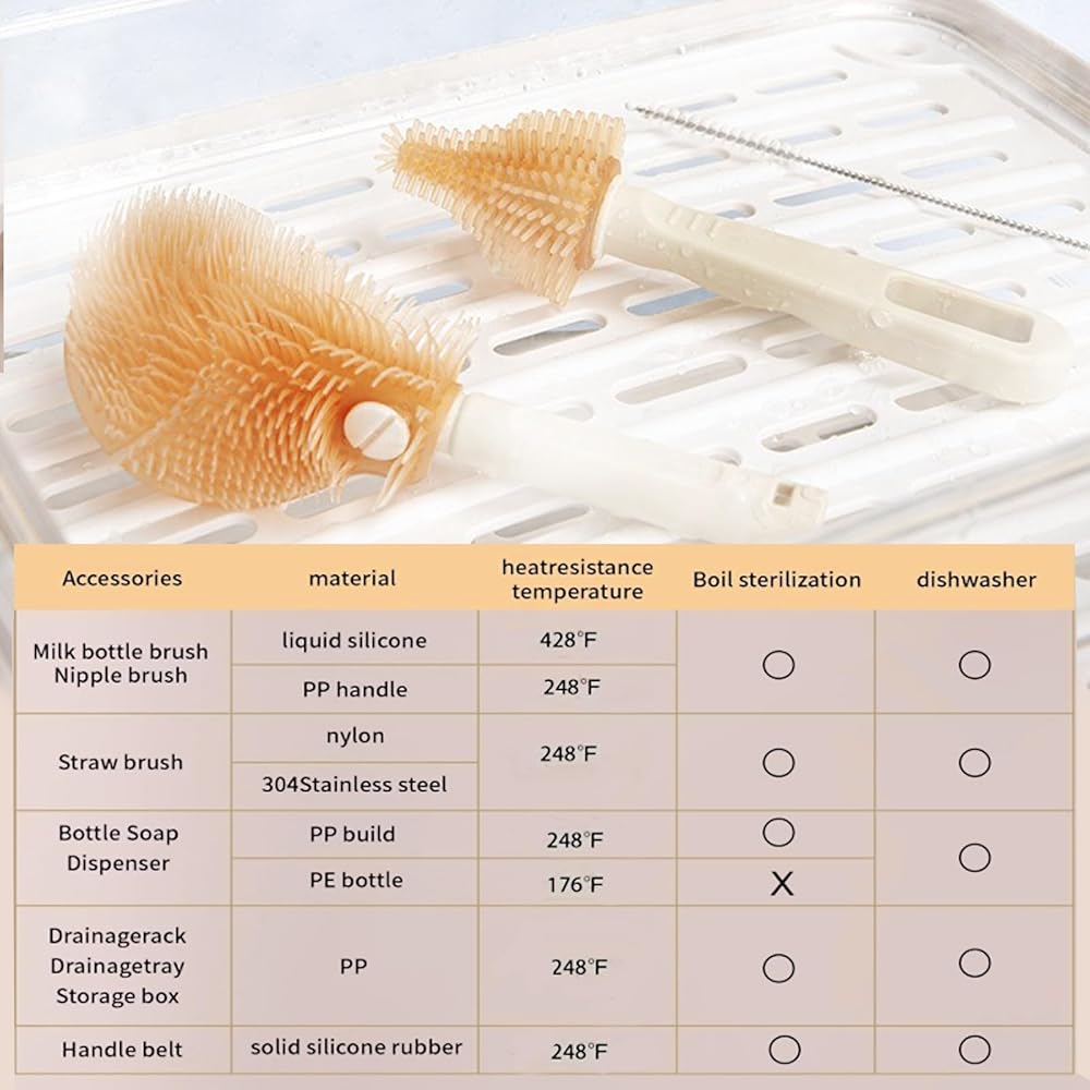 【Safe & Durable Material】Made of high quality food grade ABS and liquid silicone that won't scratch bottles, safe and BPA free.The soft bristles will not fall off and wear little, and will not scratch the items being cleaned.