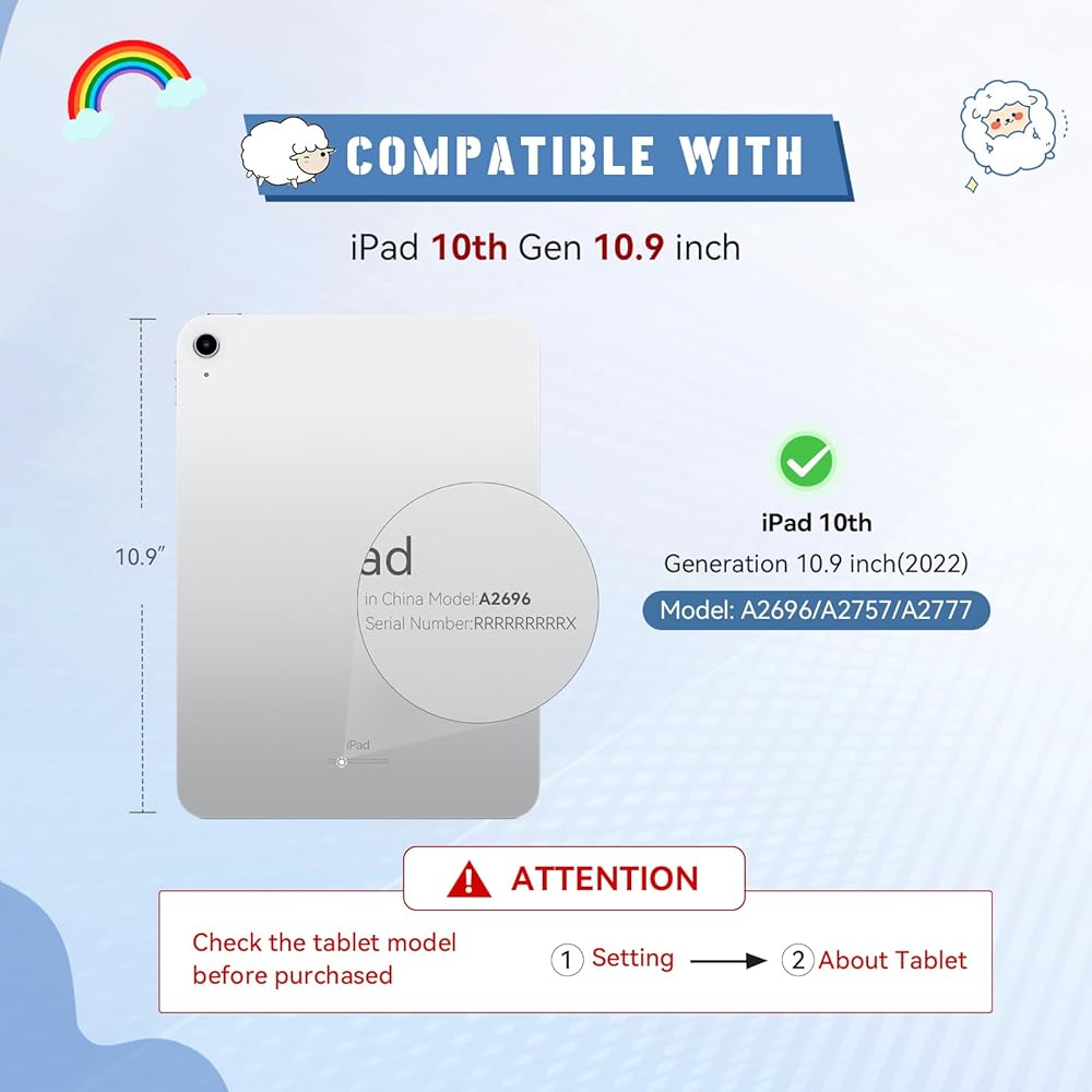 🐑【Compatibility】 The iPad 10th Generation Case ONLY fit for iPad 10th Generation 10.9 Inch 2022 released (Model number: A2696, A2757, A2777). Check the model on the back of the iPad, please confirm the model before placing an order.
