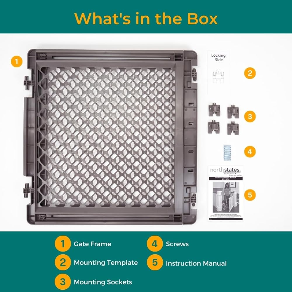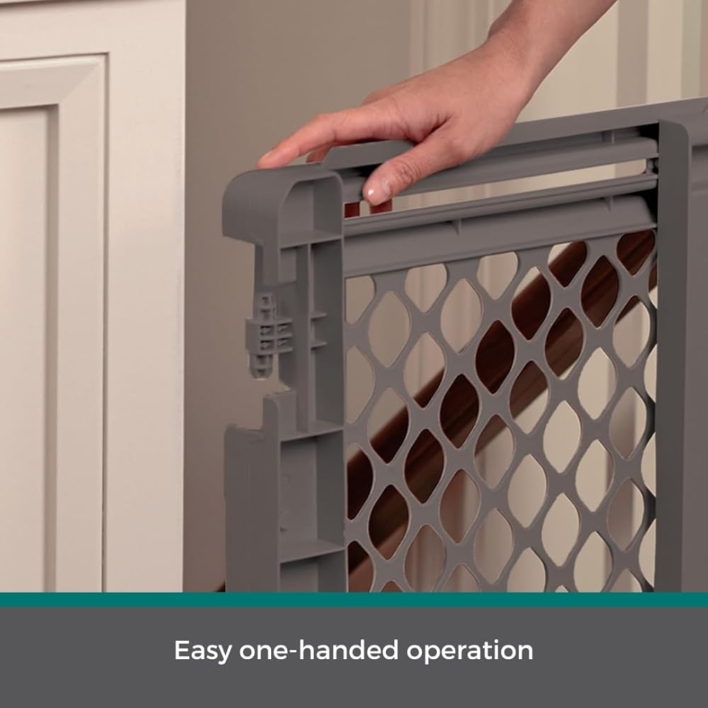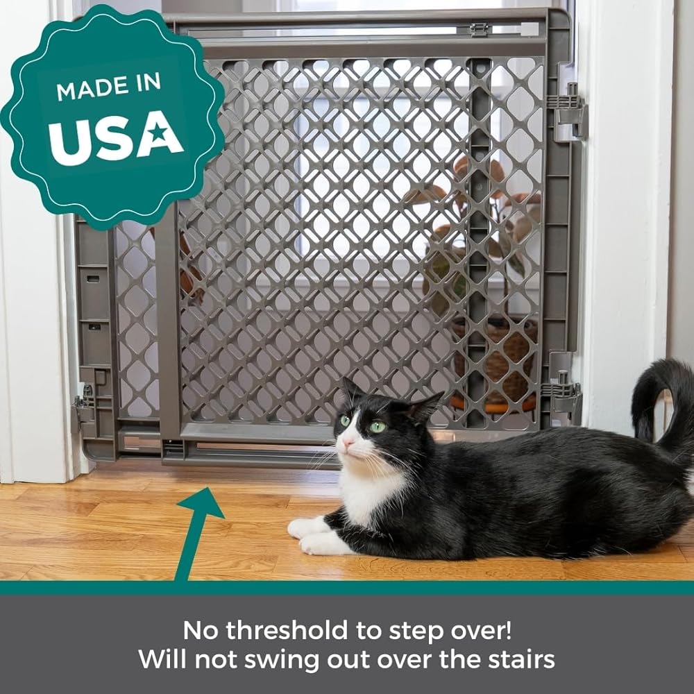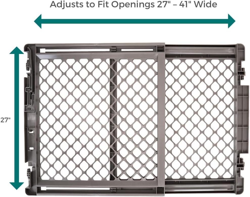 The MyPet 2-in-1 Easy Swing Petgate by North States is a must-have for any home. This dog gate stands 27" and is designed to secure your pet in a designated area. Made of durable plastic, this pet gate is the perfect solution to use at the top or bottom of a staircase, in hallways or doorways. It fits openings between 27" – 41" wide, making it an ideal choice for most areas around the house. This hardware mount type gate offers extra strength and security, ensuring it withstands even the most energetic pets. You'll love the uncomplicated ease of the one-handed operation and the security it provides. This dog gate has no threshold to step over and when installed correctly it will not swing outward over stairs. Includes all the hardware needed for mounting as a swing gate. When not in use, simply swing the gate out of the way. Crafted in an elegant light gray finish, the MyPet 2-in-1 Easy Swing Petgate not only provides functional benefits but also blends seamlessly with your home décor. This dog gate is suitable for a variety of locations, making it a versatile pet gate for stairs, doorways and wide openings. The walk-through design of this pet gate makes it highly convenient for pet parents to move around. Whether you're looking for pet gates for doorways, pet gates with a walk-through door, or even a cat gate, this product serves all purposes. Proudly made in the USA