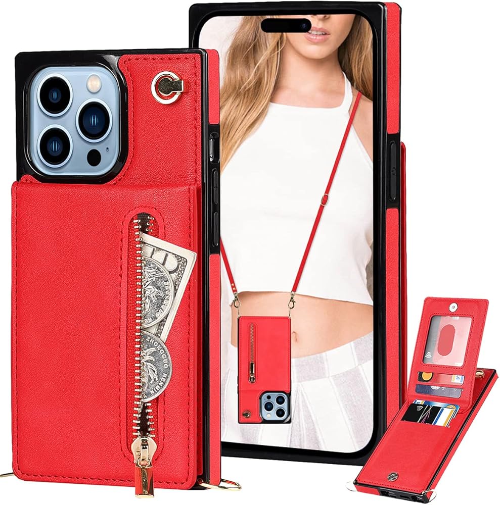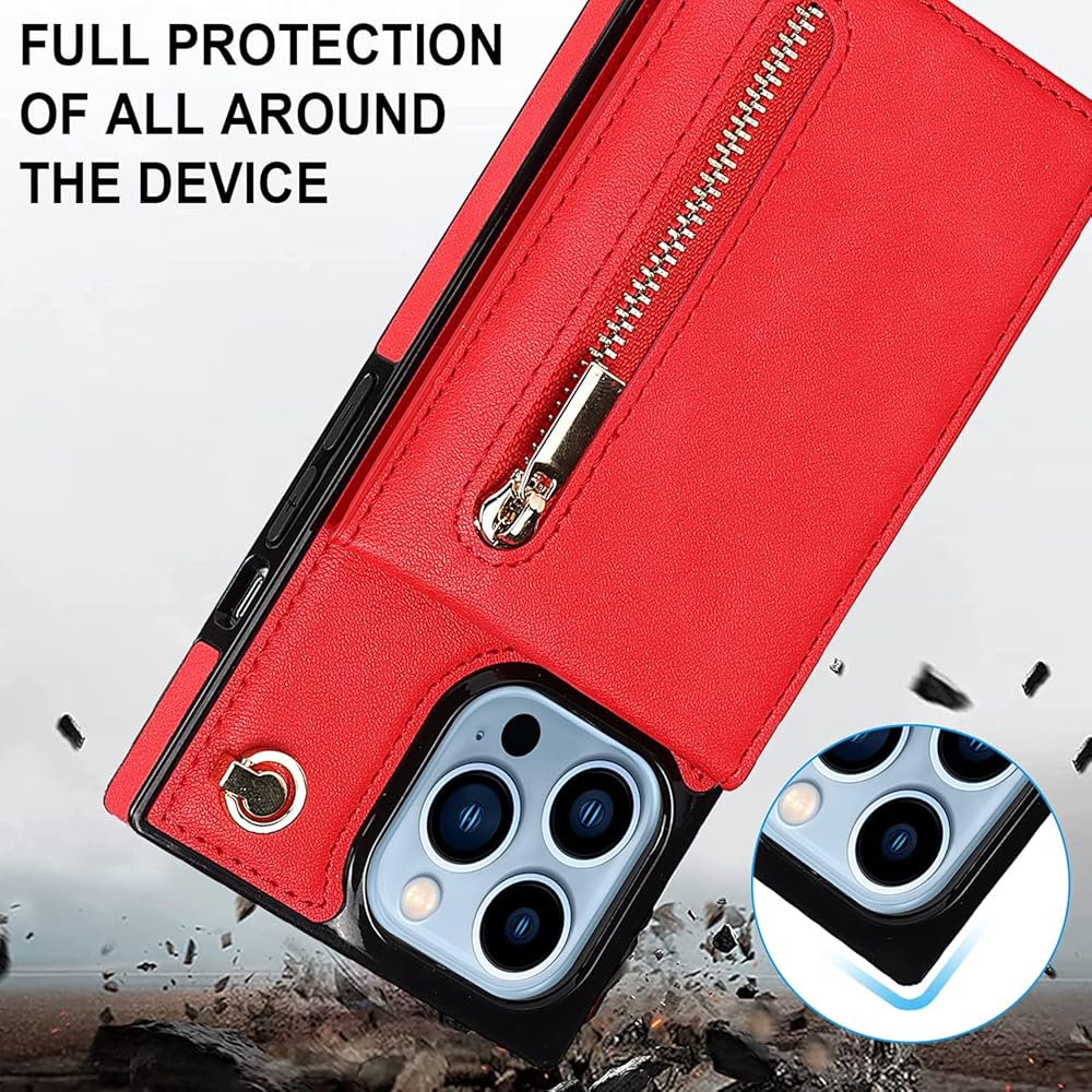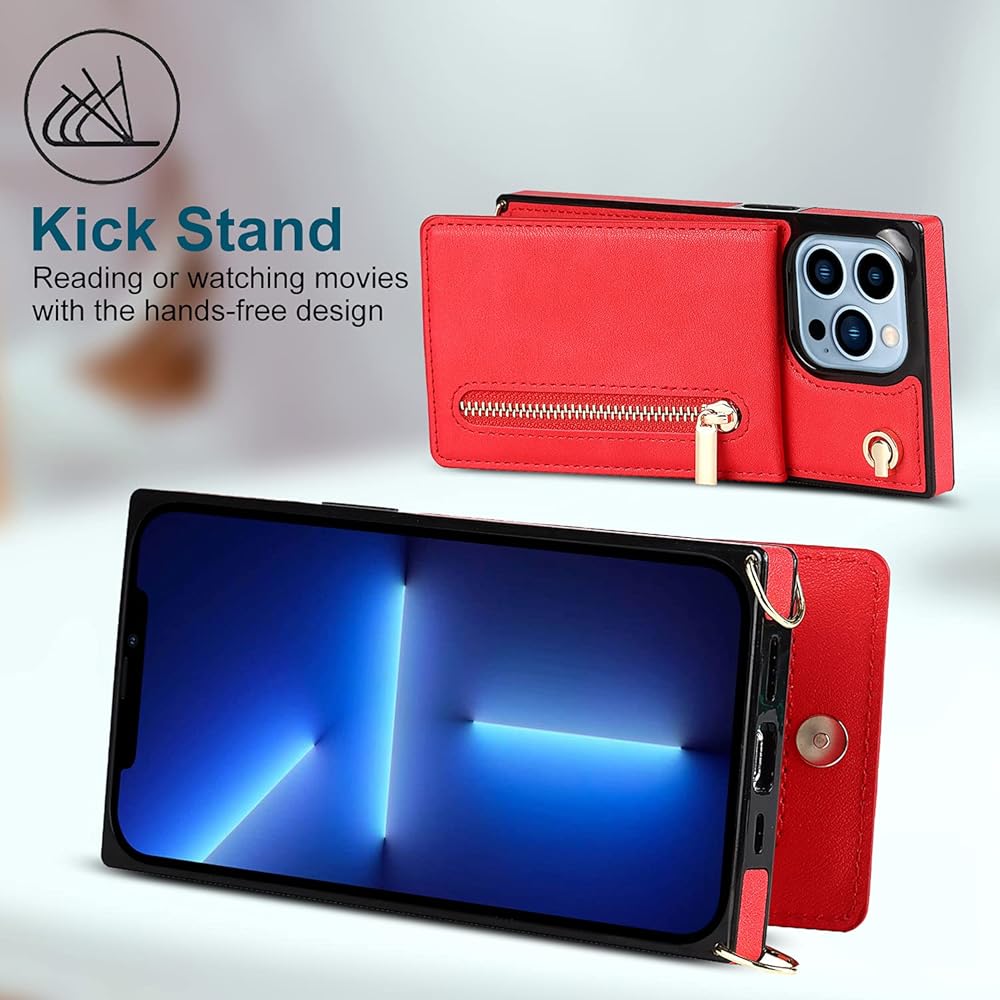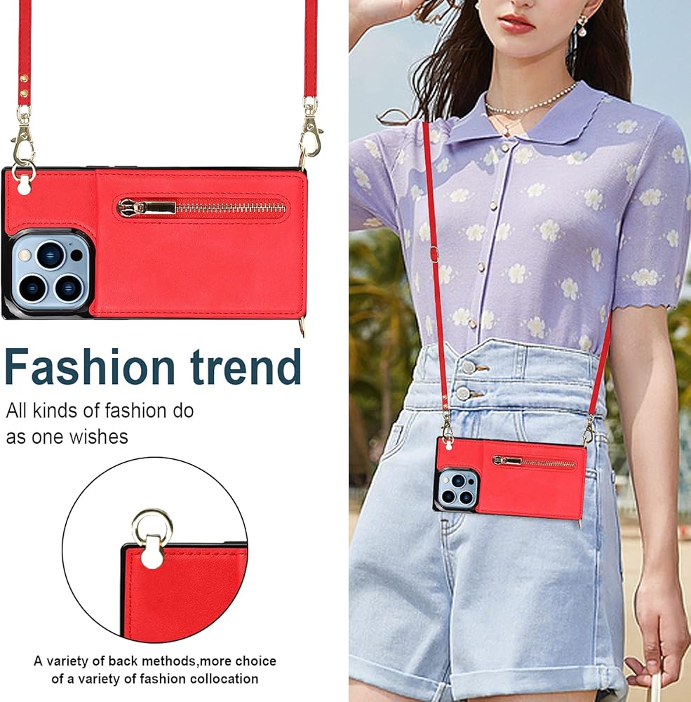 Crossbody Wallet Case for iPhone 13 Pro Max with Card Holder, Lanyard Purse Cover Removable Cross Body Strap with Kickstand for iPhone 13 Pro Max Zipper Case Red