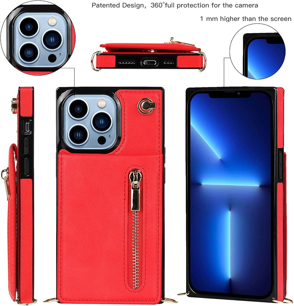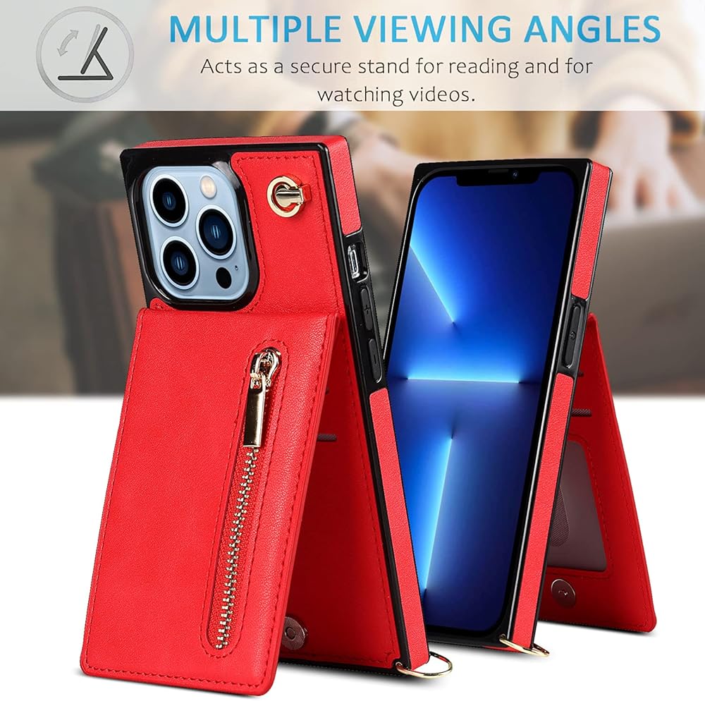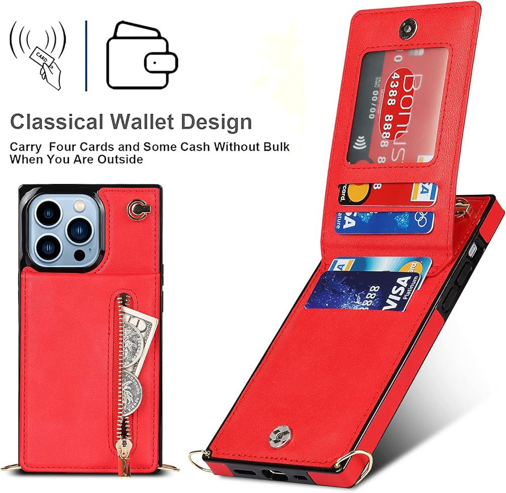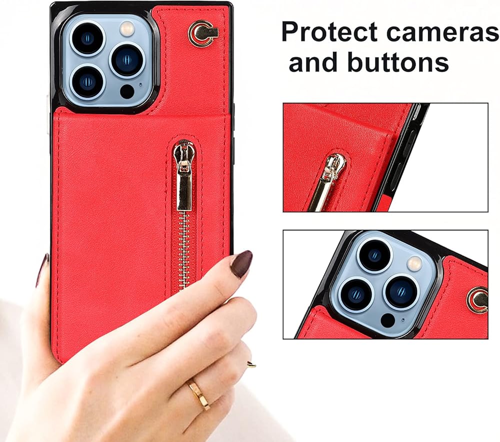 Crossbody Wallet Case for iPhone 13 Pro Max with Card Holder, Lanyard Purse Cover Removable Cross Body Strap with Kickstand for iPhone 13 Pro Max Zipper Case Red