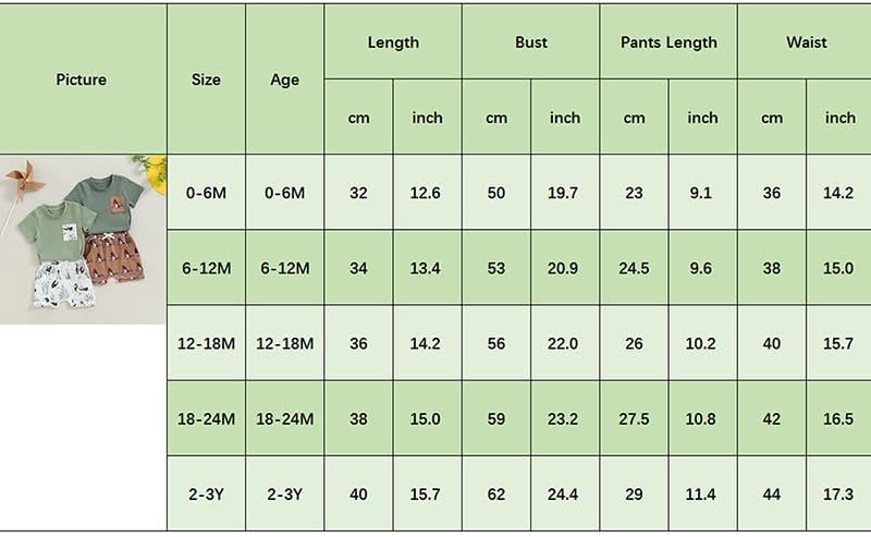 6-12M Tops Length: 13.39 Bust: 20.87 Pants Length: 9.65 Waist: 14.96 Advised Age: 6-12 Months