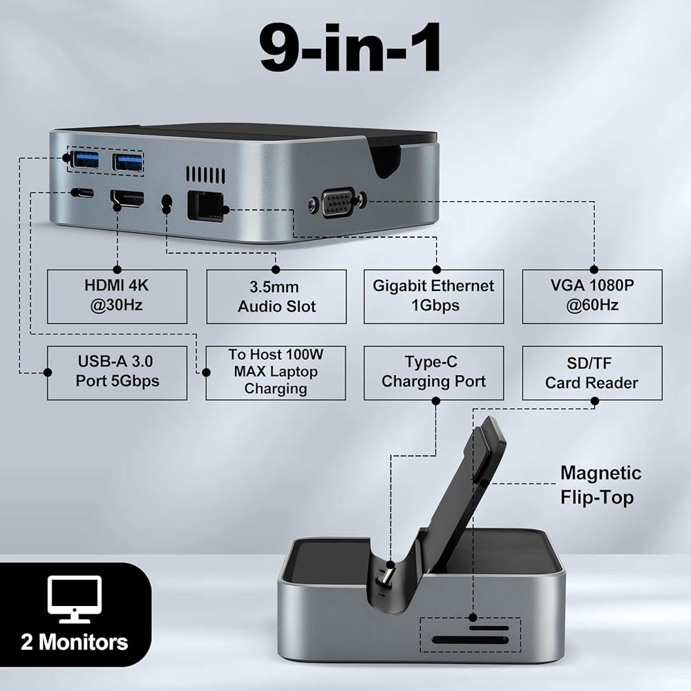 [9-in-1 Docking Station for Laotop]This is a multi-functional docking station hub unique designed for laptop,you can easily expand up to 9 additional ports through a single port, including: 1*HDMI (4K@30Hz)、1*VGA(1080P)、1* Gigabit Ethernet Adapter、1*100W PD Charging Port、2*USB-A 3.0 ports、 1*3.5mm AUX slot 、1*SD card reader and 1*TF card reader.