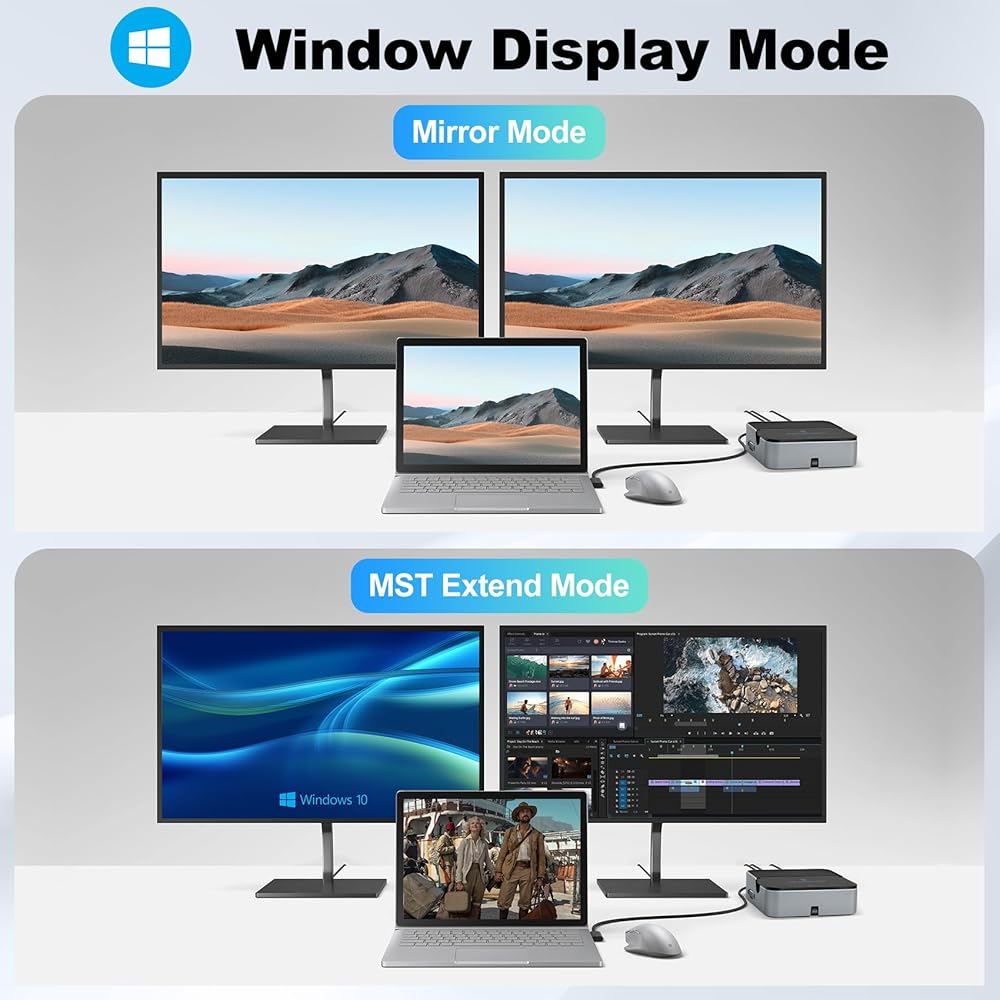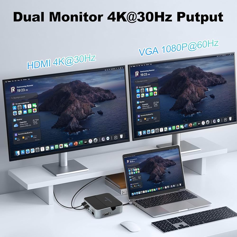[4K Display Docking Station]Daakro docking station for multiple monitors with HDMI and VGA outputs triple display up to 4K video. When only one port work, HDMI port support 4K@30Hz resolution, and VGA support 1080P@60Hz. When two port work:HDMI + VGA: 1080P@60Hz.❤Please Notice: MacOS ONLY support SST(Mirror Mode: display the SAME image) due to the MacOS limitation. Windows support MST(Extend Mode) and SST(Mirror Mode).