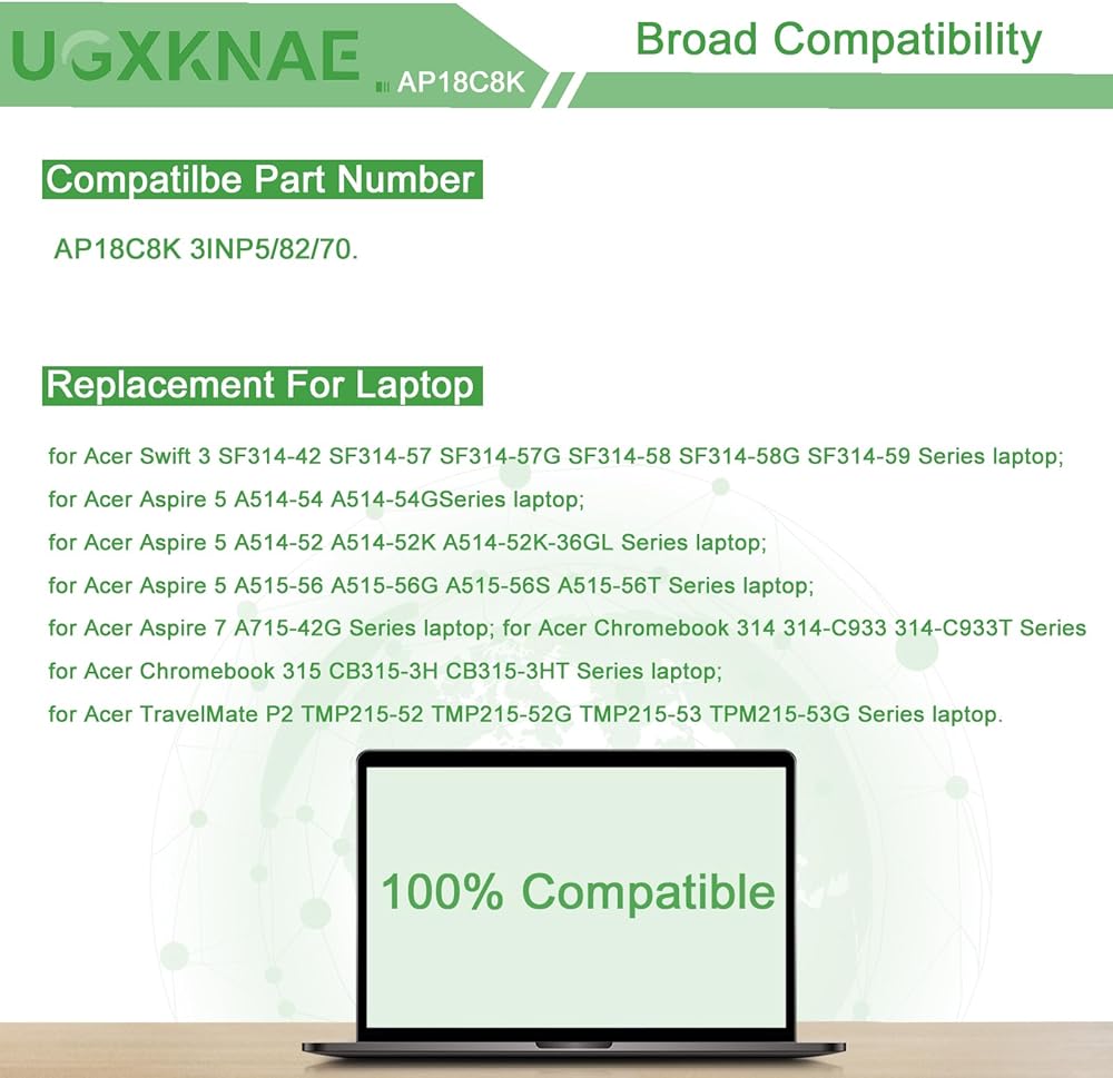 ✅ 【Compatible Laptop Models】Replacement for Acer Swift 3 SF314-42 SF314-57 SF314-57G SF314-58 SF314-58G SF314-59 Series laptop; for Acer Aspire 5 A514-54 A514-54GSeries laptop;for Acer Aspire 5 A514-52 A514-52K A514-52K-36GL Series laptop; for Acer Aspire 5 A515-56 A515-56G A515-56S A515-56T Series laptop;for Acer Aspire 7 A715-42G Series laptop; for Acer Chromebook 314 314-C933 314-C933T Series laptop; for Acer Chromebook 315 CB315-3H CB315-3HT Series laptop;for Acer TravelMate P2 TMP215-52 TMP215-52G TMP215-53 TPM215-53G Series laptop.