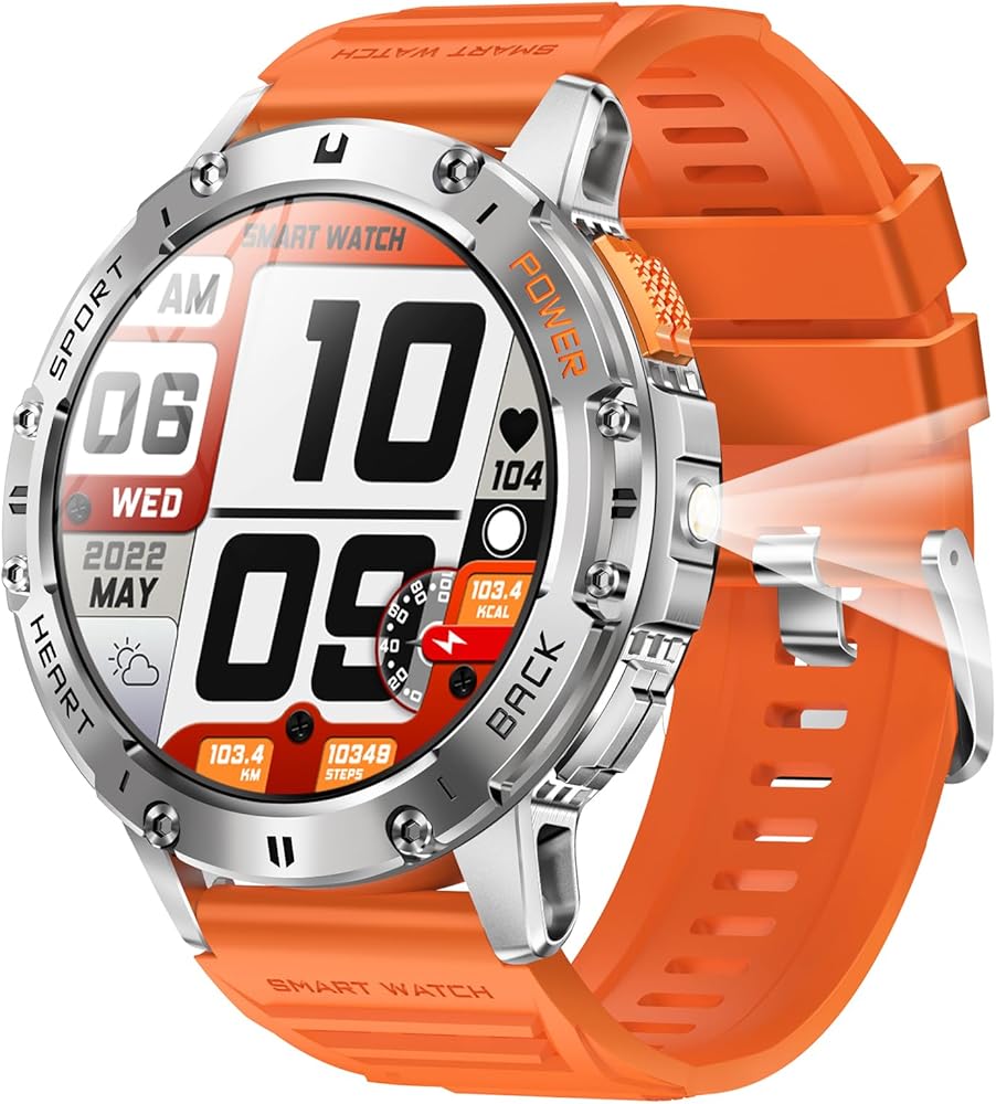 【Rugged Military Smart Watch with Flashlight 】The tactical smartwatch's case is made of zinc alloy and has passed several military-grade tests, rugged and durable. 1.43" HD AMOLED smartwatch for men is equipped with a bright LED flashlight on the side and built-in 530mAh battery to ensure illumination and battery life.You can wear your smartwatch on your outdoor adventures, night running, short-term home lighting, etc very convenient. The smart watch with flashlight can help you light the road in the wilderness, so you will no longer be afraid of the dark!