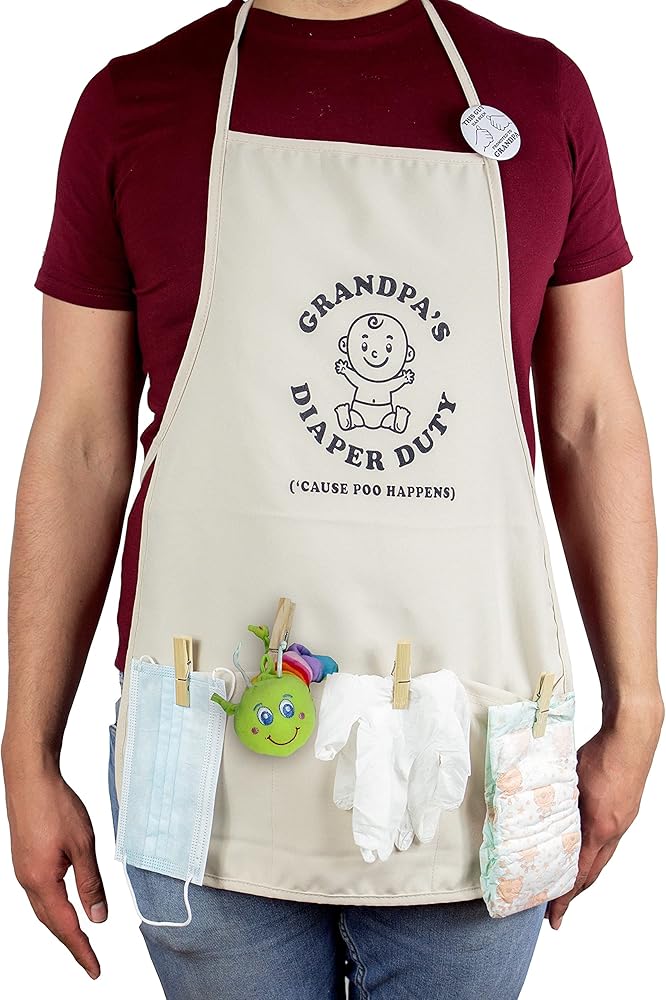VALUE PACK -Grand Dadgear contains high quality beautifully designed apron, a pair of rubber gloves, a face mask, a ¨This Guy has been promoted to Grandpa¨ pin, wooden clothes pins (stay green), one diaper, and as a PLUS, a brand new stuffed animal plush toy to keep the little one distracted. This apron also contains pockets to store hand sanitizer, baby wipes, towels for emergencies. Letters on the apron are in black.