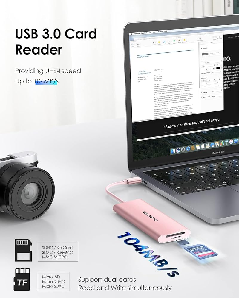 5Gpb/s Data transfer & Dual Cards Reader 3.0 - 3 USB 3.0 ports transfer rate up to 5Gbps, 10X faster than USB 2.0 (480 Mbps) and the Card Reader ports providing UHS-I speed (Up to 104MB/s), much faster than SD2.0 (25MB/s). Support dual cards read and write simultaneously