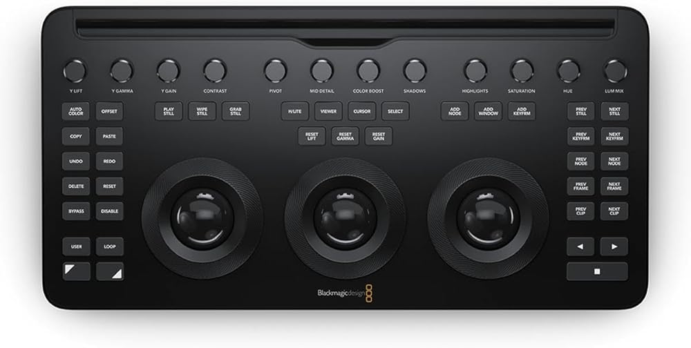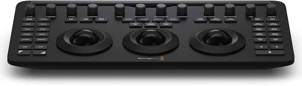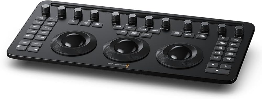 The Blackmagic Design DaVinci Resolve Micro Color Panel is a compact yet powerful color panel that gives you all the control you need to create cinematic images. The Micro Panel features a row of direct control knobs at the top of the panel, three trackballs with rings for color grading, and transport keys to speed up your grading session. Includes controls for refined color grading including adding windows and a tablet slot designed to hold an Apple iPad. Connects via Bluetooth or USB-C. DaVinci Resolve is the world's only solution that combines editing, color correction, visual effects, motion graphics, and audio post-production all in one software tool. Its elegant, modern interface is fast to learn and easy for new users, yet powerful for professionals. DaVinci Resolve lets you work faster and at a higher quality because you don't have to learn multiple apps or switch software for different tasks. That means you can work with camera original quality images throughout the entire process. It's like having your post-production studio in a single app. Best of all, by learning DaVinci Resolve, you're learning how to use the same tools used by Hollywood professionals.