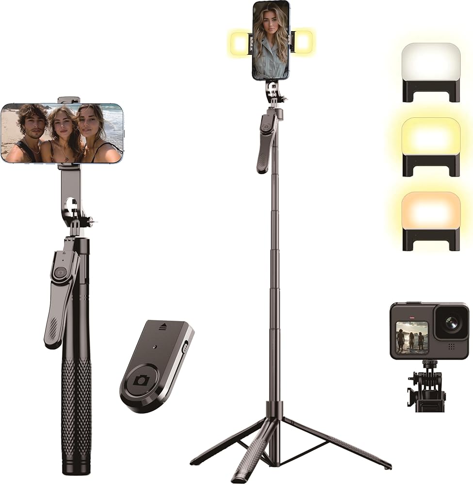TALL: This Heavy Duty Phone Tripod with Light features a 3-in-1 design, serving as a selfie stick, tabletop tripod, and phone stand, extends to an impressive 84.6 inches for over head. In addition, its telescopic pole is made of aluminum alloy, sturdy and durable.