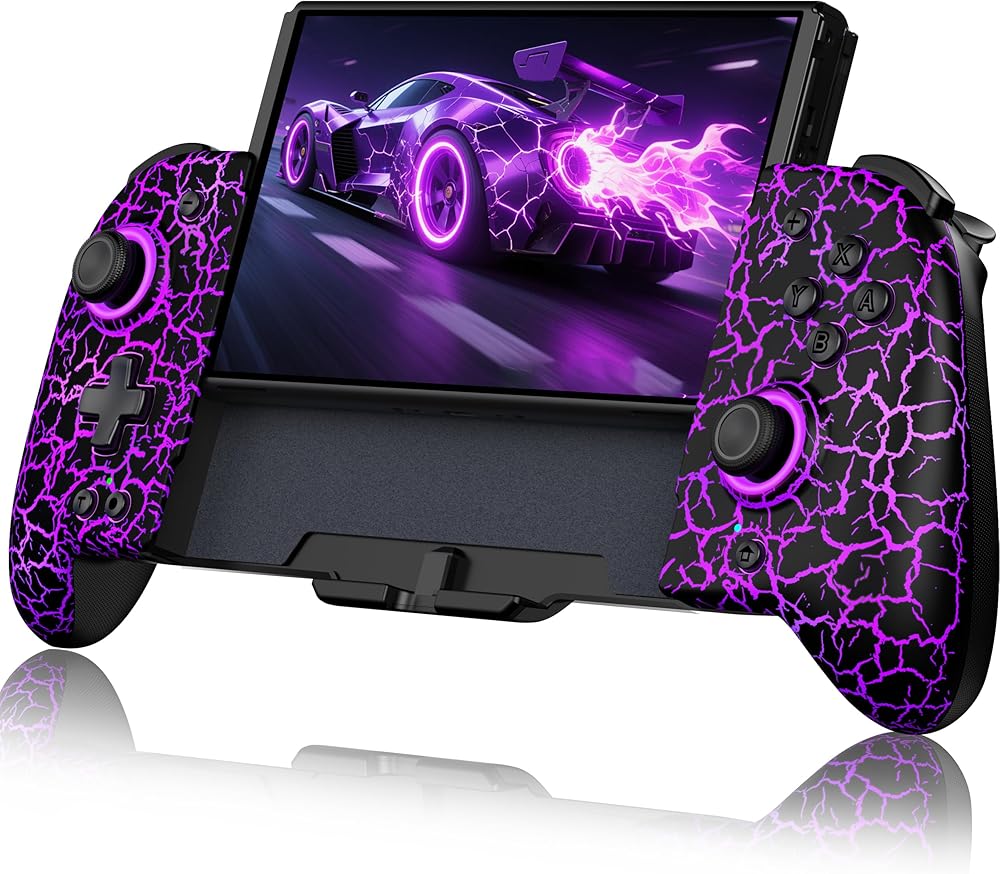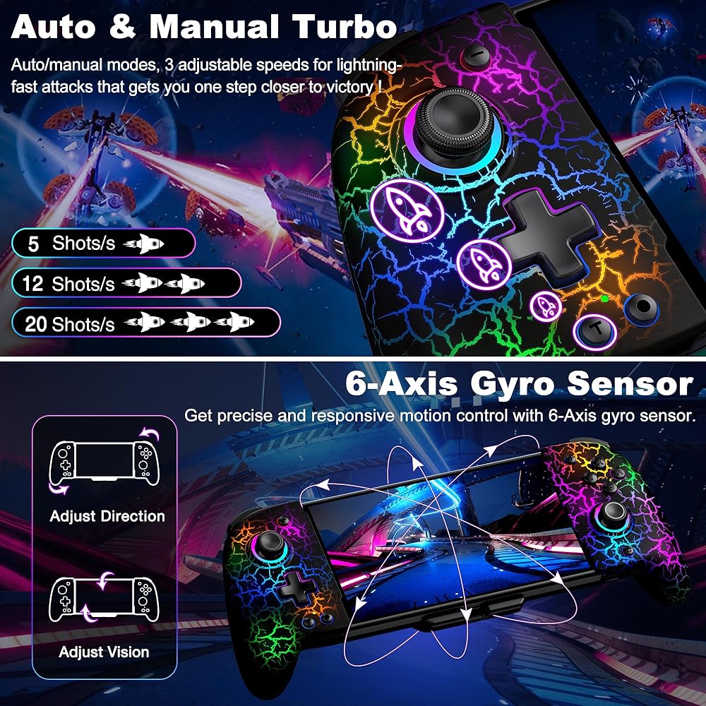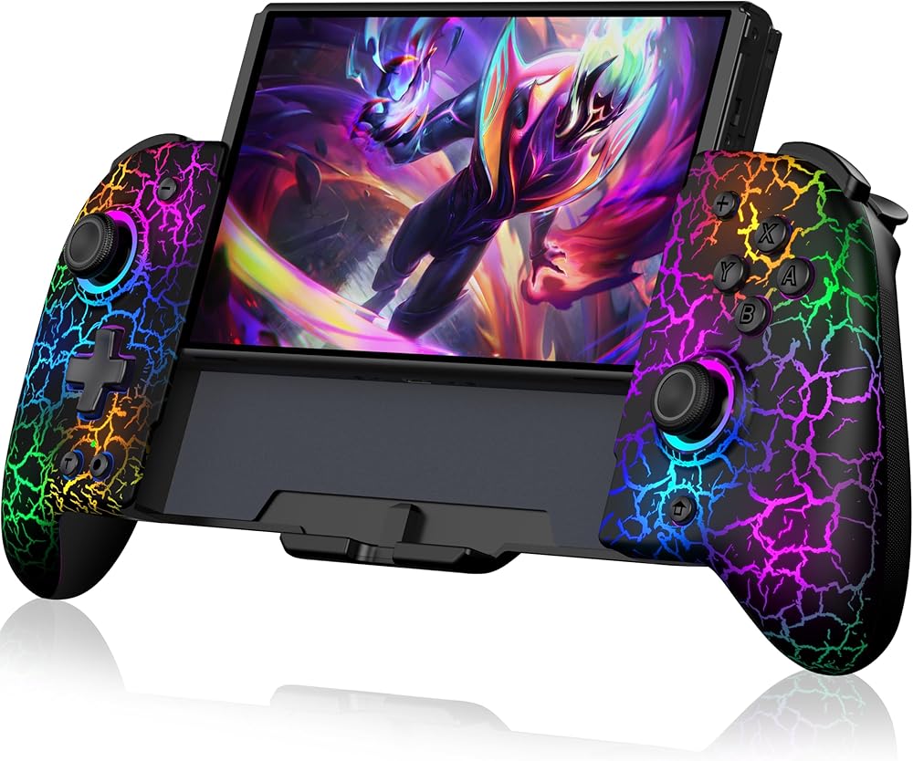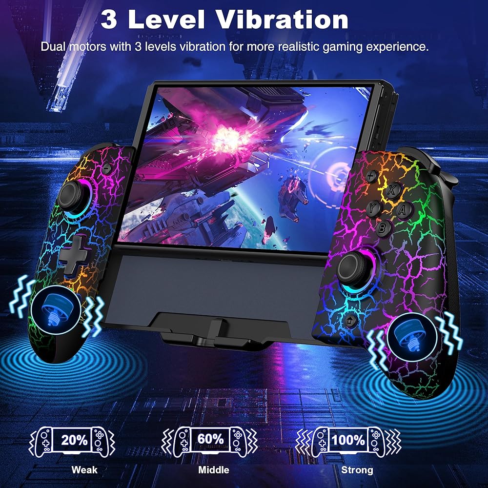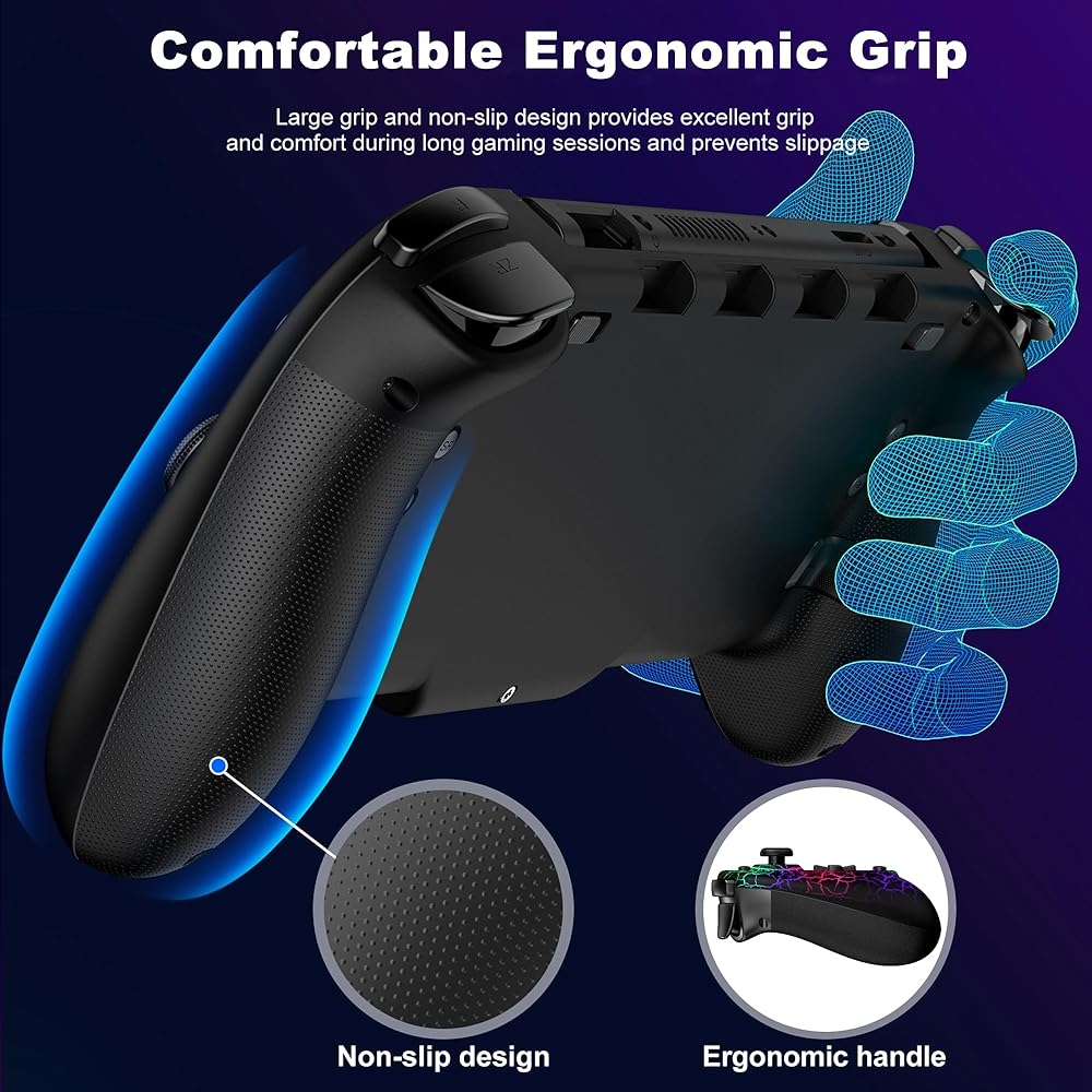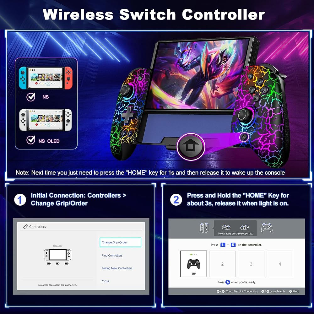 Cool Lighting &1000mAh Battery: Our switch wireless controller has 17 adjustable light colors, including static, breathing and flashing modes. You can adjust it according to the game scene and enjoy the immersive feeling. In addition, the switch oled grip is equipped with a 1000 mAh battery and a Type-C 2-in-1 charging cable. After only 3 hours of charging, 10 hours of non-stop gaming can be achieved. The "Y"-shaped charging cable can also charge the switch and controller at the same time.