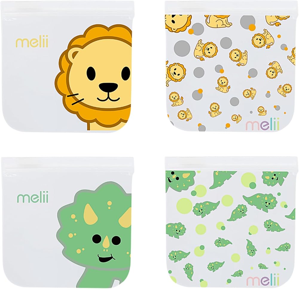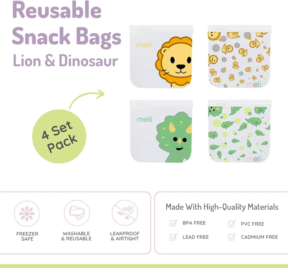 MAKE FEEDING FUN: Packing lunch and snacks has never been more adorable than with Melii's Reusable Snack Bags! The set includes 4 large-capacity bags featuring our signature Melii animal characters: Bulldog, Cat, Lion, Panda, Bear, Shark, Dinosaur and Unicorn. These food storage bags help make a healthy and waste-free choice for your on-the-go family!