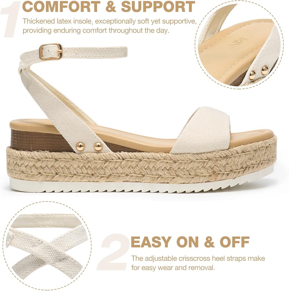 [Comfort&Stability] :These Comfortable wedge sandals for women feature a plush thickened latex insole wrapped in soft synthetic leather that molds to your foot's shape. Extra anti-blister padding is strategically placed at the vamp , they promise lasting comfort all day long. Plus, the adjustable crisscross heel straps allow for effortless slipping on and off. The espadrille platform wedges hances stability, giving you the freedom to walk with complete confidence.