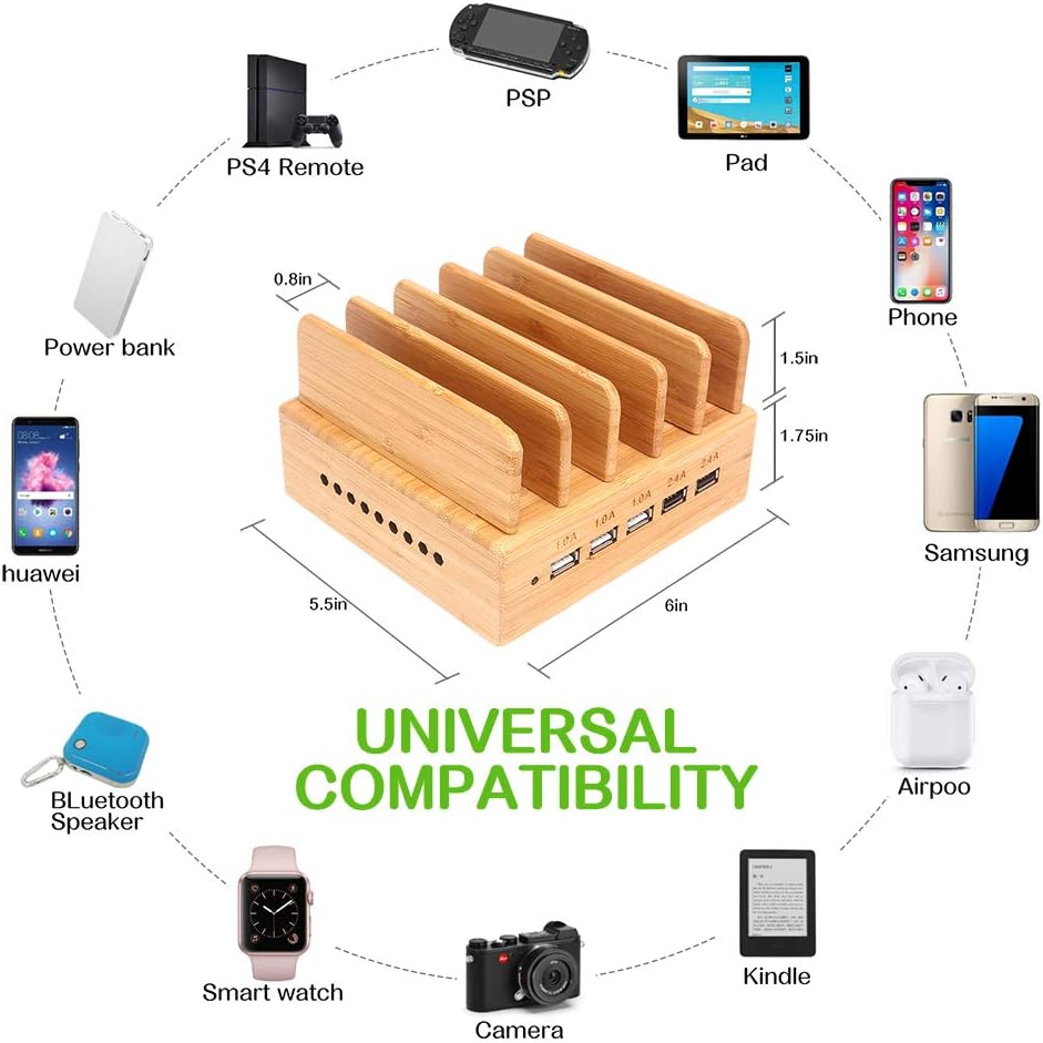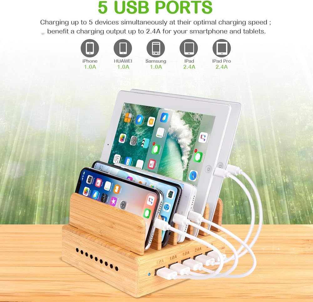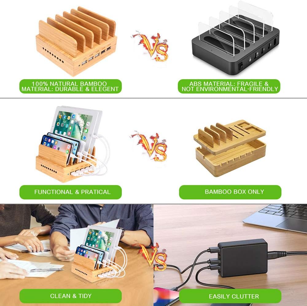 Bamboo Charging Station, Wood Charging Station for Multiple Devices with 5 Ports USB Charger Docking Station for iPhone, iPad,Tablet, and Android Cell Phone