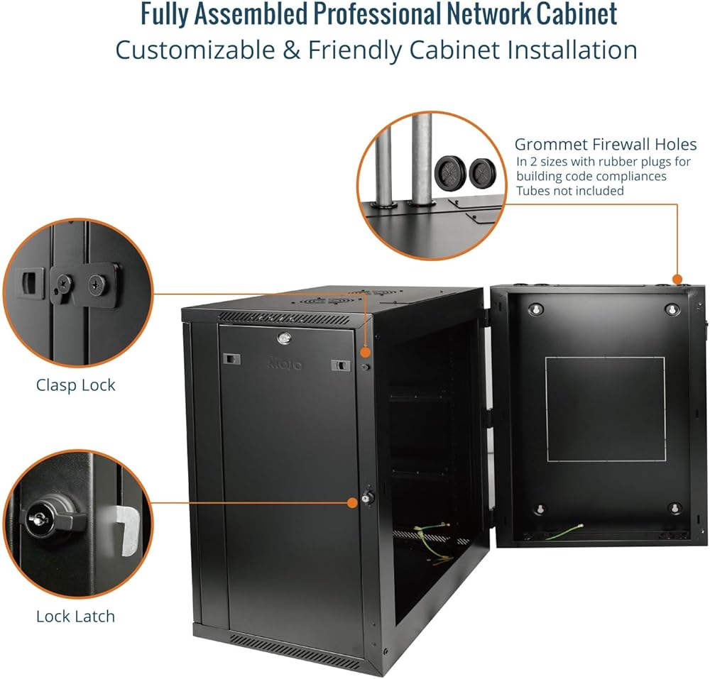 【Thoughtful Design】: Server Rack Cabinet with removable top cover, back cover and swing gate back door facilitate ventilation and cable management; Built-in L Brackets support non rack-mountable equipment; Two kinds of fireproof wall holes of sealing rings of different sizes with rubber plugs excluding tubes