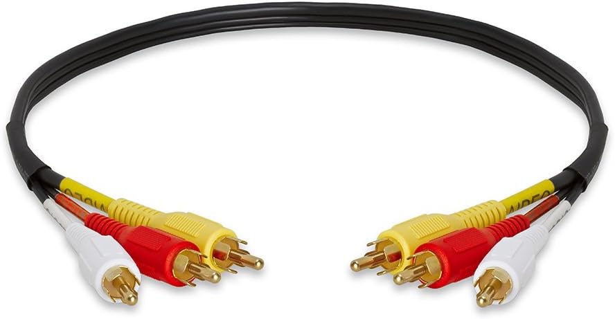 RCA Composite Video Audio cables are excellent for connecting your VCR, DVD, HD-TV, and all other home theater audio/video equipment. These high performance gold contact cables are colored for easy installation and identification of video and left and right channels and are 100 percent shielded offering superb protection against EMI/RFI interference. 1.5 foot Gold RCA Audio/Video Cable - Stereo. Connectors: 3 Male RCA to 3 Male RCA . Gold Contacts for high performance. Shielded to prevent EMI/RFI interference. Designed to connect RCA audio/video devices. Low-Loss Fully Shielded RCA Dubbing Cables. Applications include home theater, DSS receivers, S-Video VCRs, camcorders and DVD players. 1 RG59-Video + 2-Shielded Audio Conductors. 95 percentage Spiral-Wound-Shield Audio Conductors. Fully Molded Color-Coded Gold RCA Connectors. Flexible Black PVC Jacket