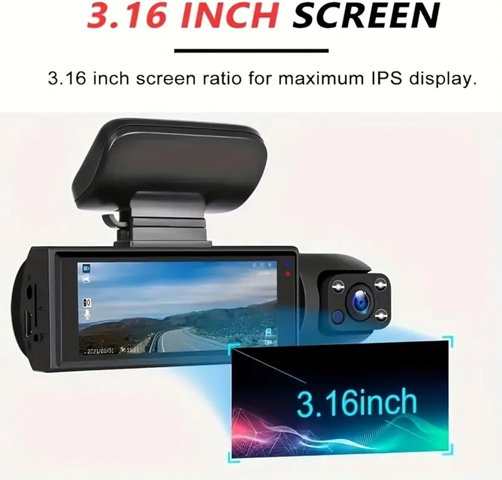 كاميرا داش كام مزدوجة 1080 بيكسل للسيارات، مسجل القيادة مع رؤية ليلية بالأشعة تحت الحمراء، تسجيل حلقي، عدسة واسعة الزاوية - شاشة IPS 3.16 بوصة، وضع ركن السيارة، كاميرا سيارة مع بطاقة TF سعة 32 جيجابايت