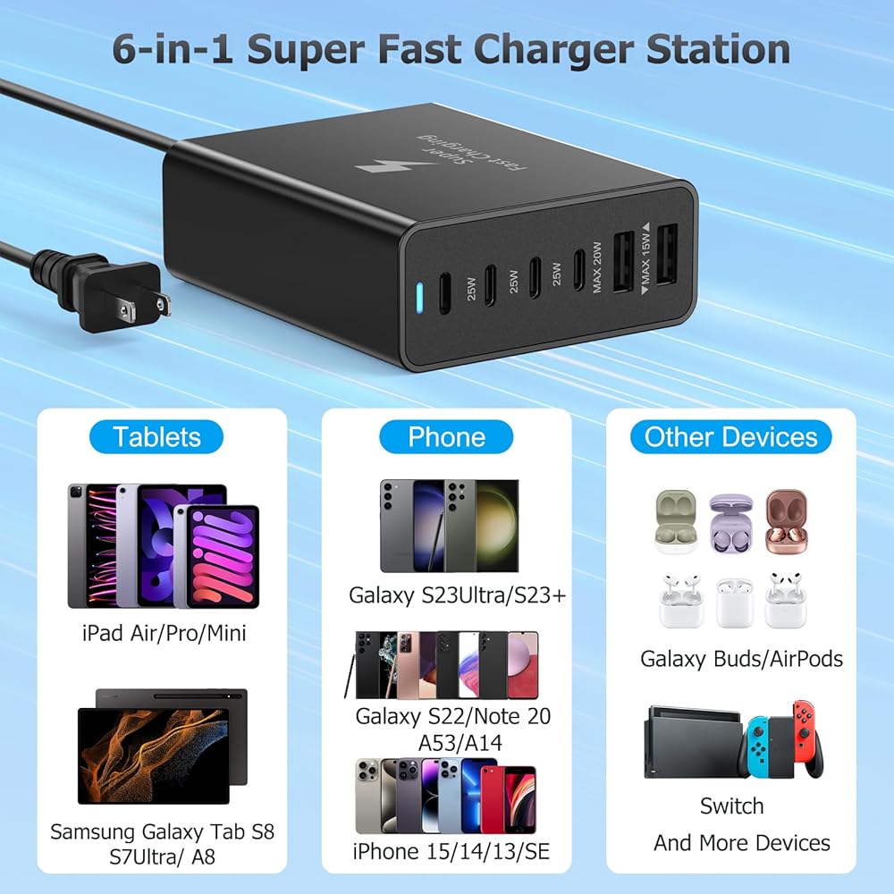 [6-in-1 Desktop Charging Station] With multi usb a and usb c ports combined in one wall charger, this total 125w usb c charger station can meet your multiple devices charging needs. With 4 latest usb c charging port and 2 tradtional usb a charging ports, the charger station can help you save much space and keep you desk neat. You can put it on your desk or nightstand for overnight charging.