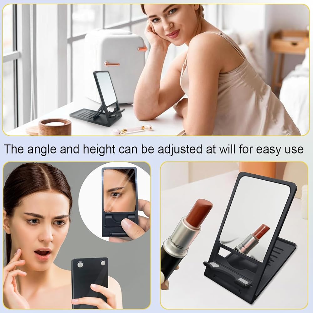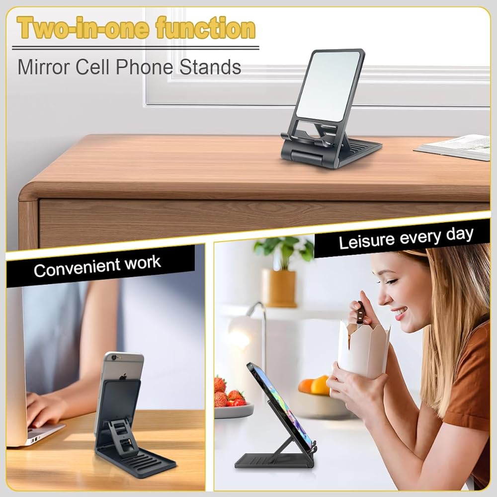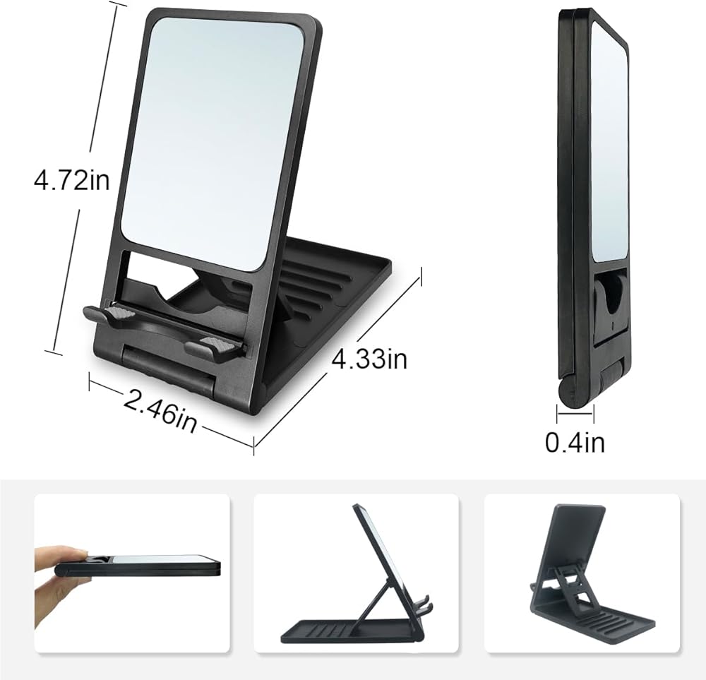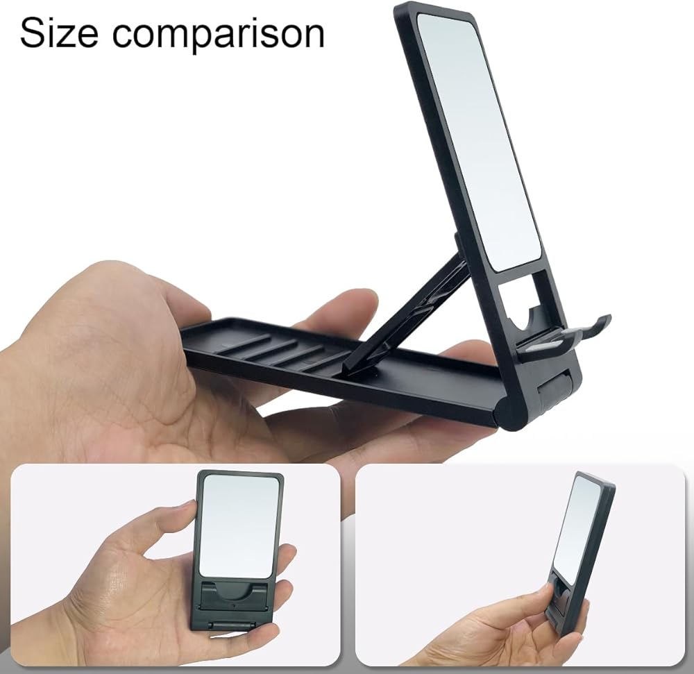 【MULTI-FUNCTION MIRROR】This foldable mirror with Cell phone stand, good perspective, can clearly reflect the overall appearance of the face, Premium ABS material ensures durability, Silicone pads on the bottom and cradle protect both your phone and stand from sliding and scratching surfaces.