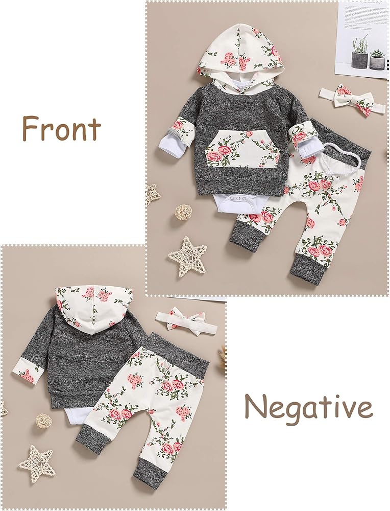 • 4 Pcs Baby Girl Clothes: A hooded sweatshirt in solid colors, paired with adorable kangaroo pockets,litter printed romper, and printed trousers with an elastic waistband for easy wear. Complete with a matching printed headband.