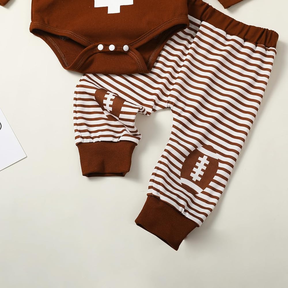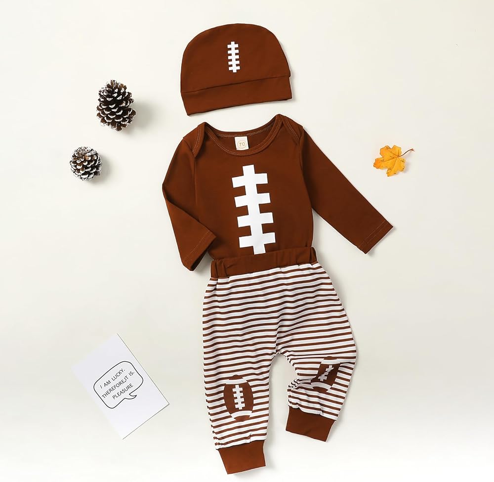 Crew Neck, Long Sleeve Football Print Rompers Bodysuits Tops, Elastic Waistband, Brown and White Striped Pants, Infant Newborn Baby Boys Fashion Football Outfits with Hat 3 Piece Fall Winter Clothes