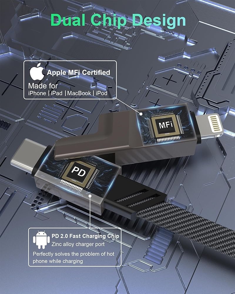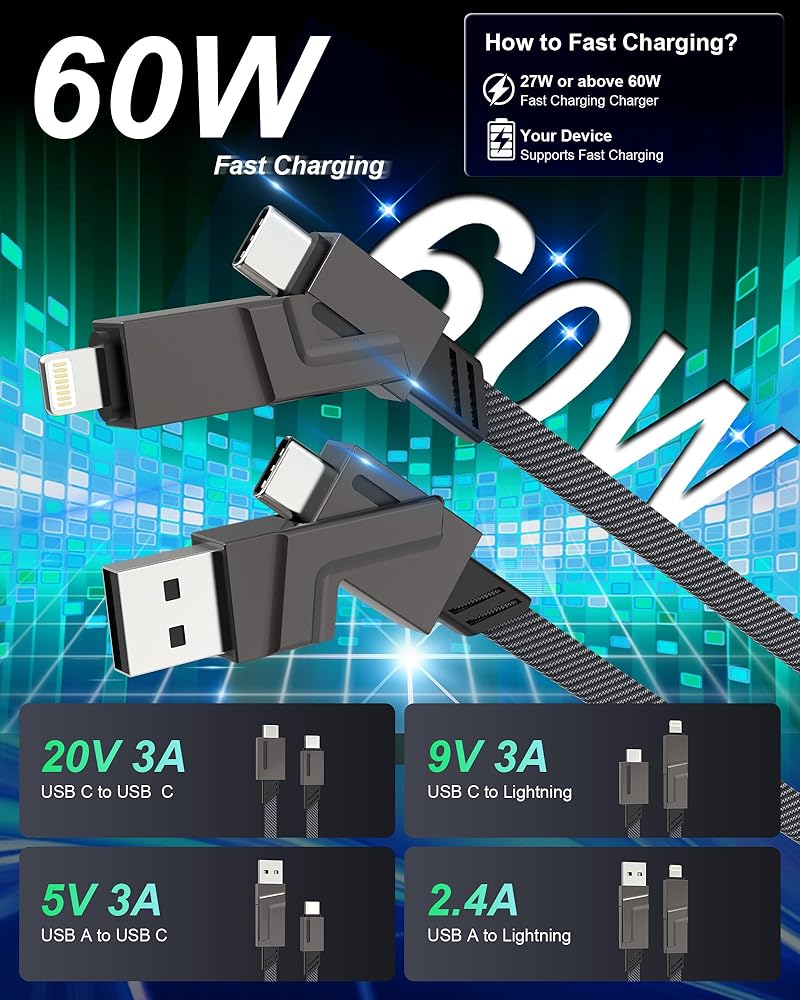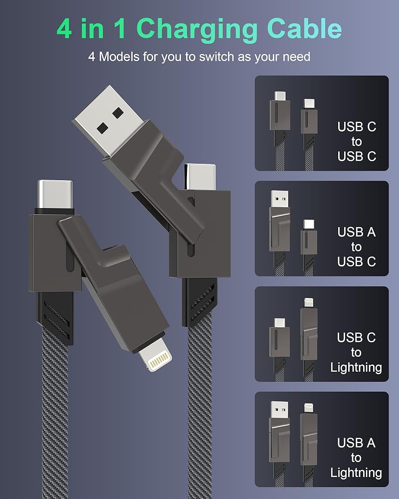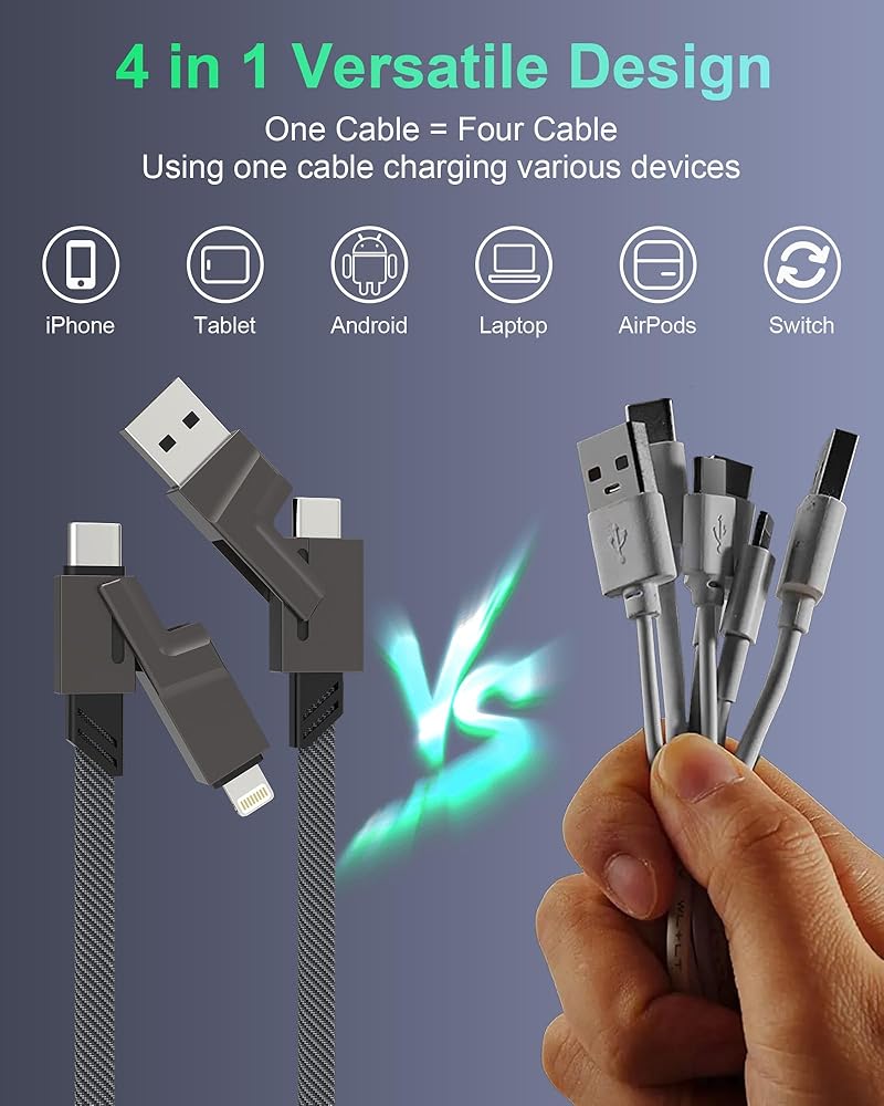4️⃣ 【𝟒-𝐢𝐧-𝟏 𝐕𝐞𝐫𝐬𝐚𝐭𝐢𝐥𝐞 𝐃𝐞𝐬𝐢𝐠𝐧】 Simplify the way you charge with our versatile 4 in 1 charging cable. One usb c charger cable combines four ports: 1️⃣ USB-C to Lightning 2️⃣ USB-C to USB-C 3️⃣ USB A to Lightning 4️⃣ USB A to USB C, which meets your variety of charging needs in one cable. No need to carry multiple cables for different devices. 6.5FT (2 meters)