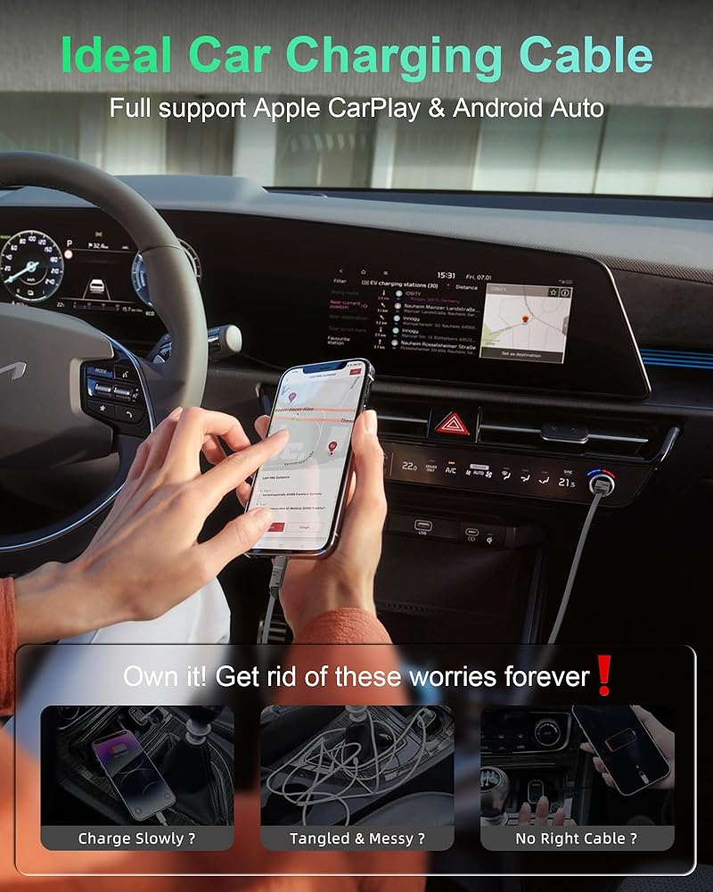 🚗【𝐒𝐮𝐩𝐩𝐨𝐫𝐭 𝐀𝐩𝐩𝐥𝐞 𝐂𝐚𝐫𝐩𝐥𝐚𝐲 & 𝐀𝐧𝐝𝐫𝐨𝐢𝐝 𝐀𝐮𝐭𝐨】These 4-in-1 usb c to lightning cables can be compatible with Apple's official Apple CarPlay and Android Auto System, charging and navigating at the same time. No matter what devices your family or friends in the car are using, we charge it all. But before using CarPlay, please confirm whether your vehicle supports the CarPlay system