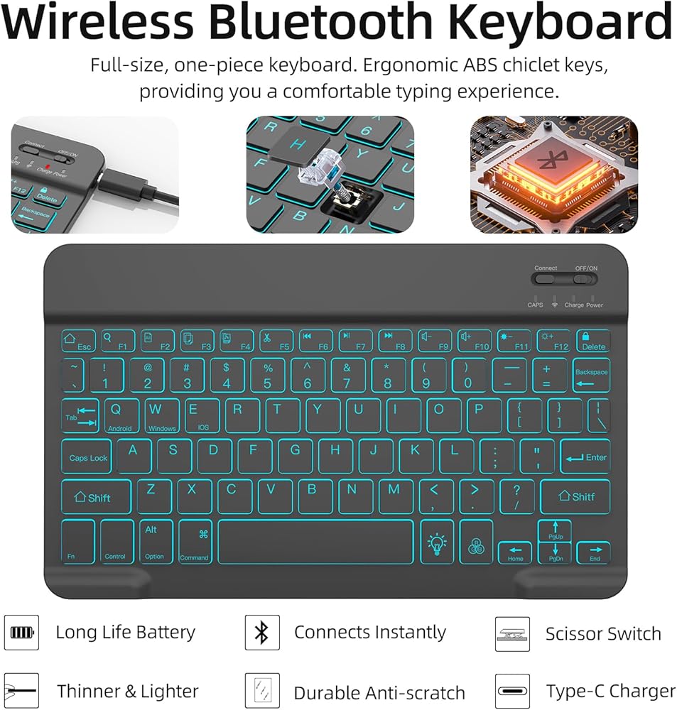 7Color Smart Wireless Keyboard - The detachable bluetooth keyboard case use of magnetic design, becoming a fashionable tablet. 7 kinds of backlight, give you more choices.Premium waterproof keyboard conductive film, the keyboard works better than others
