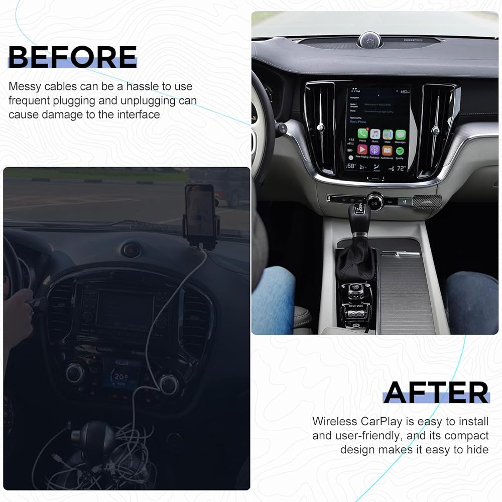 🚗【Fast and stable connection】 The CarPlay wireless adapter is equipped with a 5G chip, 5GHz WiFi and BT5.2 support, providing a stable, lightning-fast connection. The design is compact and stylish, and takes up very little space in the car. Enjoy a clean wireless audio experience without sacrificing performance or convenience. It also provides you with a wide connection range. Simply stay within a 5-meter radius to enjoy the convenience of automatic connection.