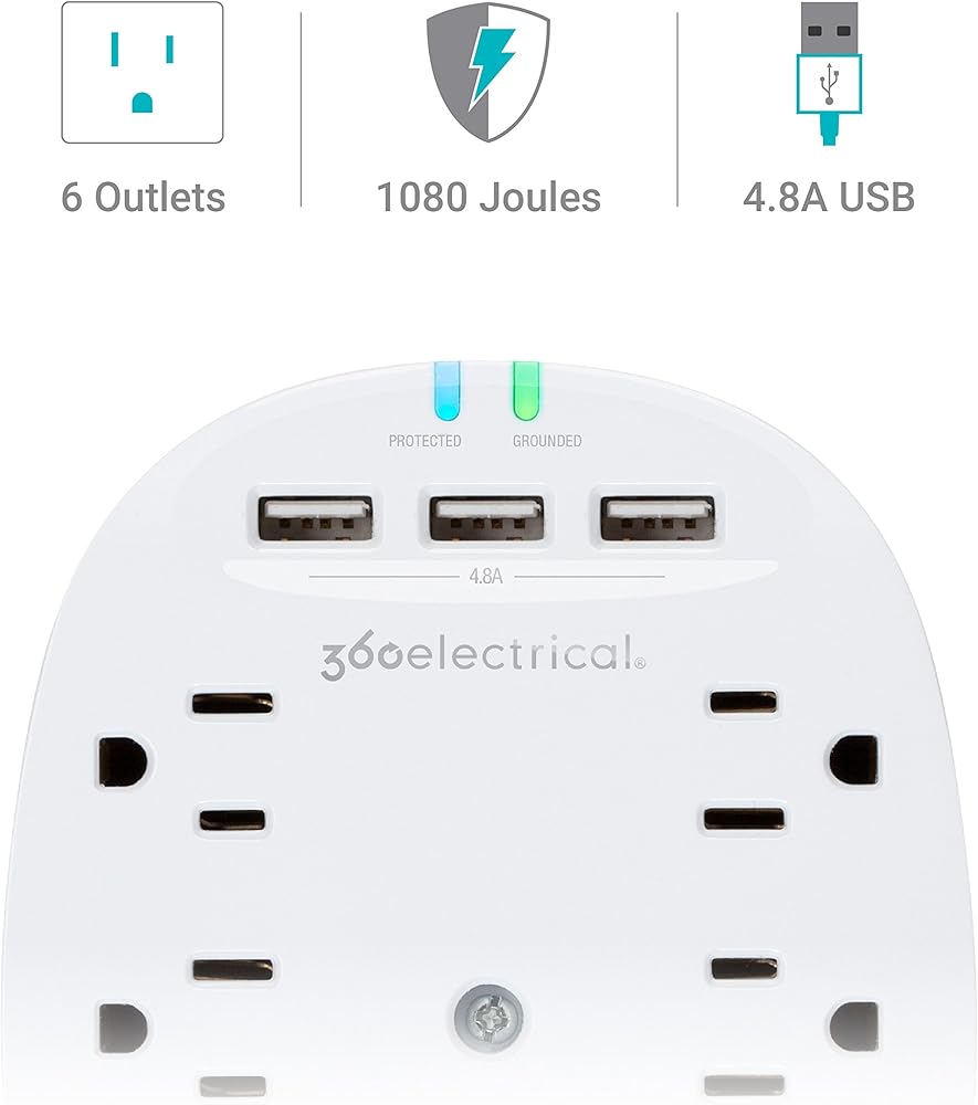 4.8A/24W Triple USB portsÂfast-charge two tablets or one tablet and two phones at the same time 6 Outlets with 2 adapter-spaced Âto fit large plugs 1080Joules of surge protectionÂsafeguards all your electronics EMI/RFI power filtrationÂfor clean, noise-free power