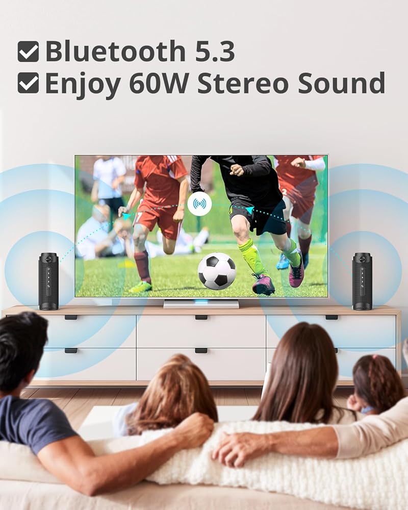 【Enhanced Bass & 360° Surround Sound】Deliver surprisingly loud and well-balanced sound with virtually no distortion through 3 drivers and Tronsmart proprietary SoundPulse patented technology. A short press of the SP button gives more punchy bass and livens up the party. It allows you to pair 2 Bluetooth speakers with lights together via Bluetooth to create left and right channels for 60W true stereo sound.